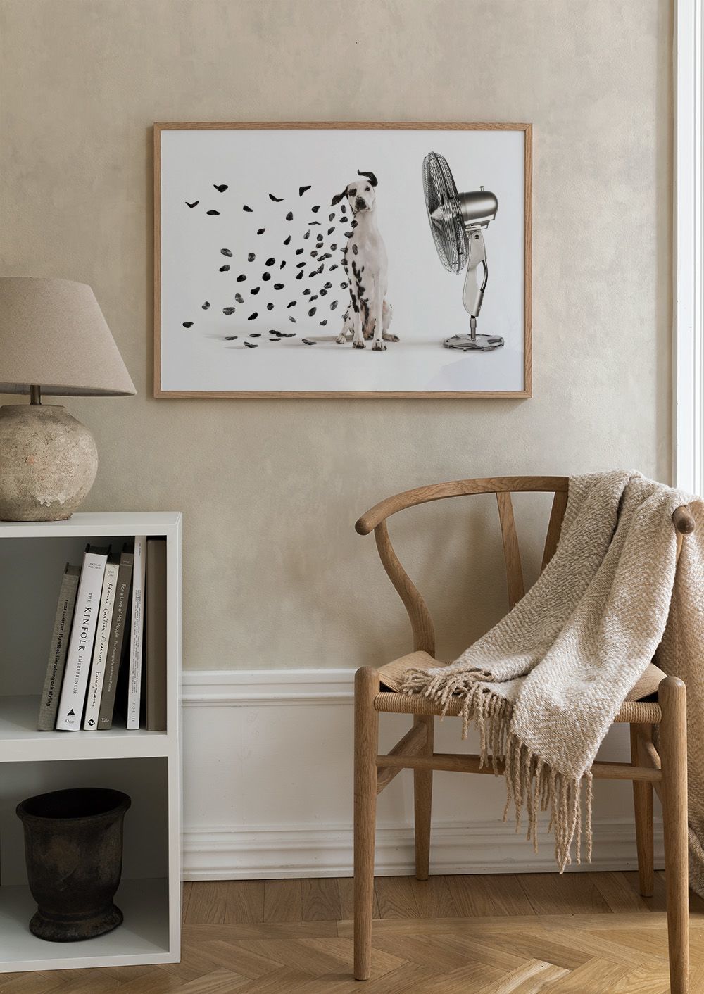 Une affiche amusante avec un dalmatien blanc et ses taches noires qui s'envolent au vent d'un ventilateur.