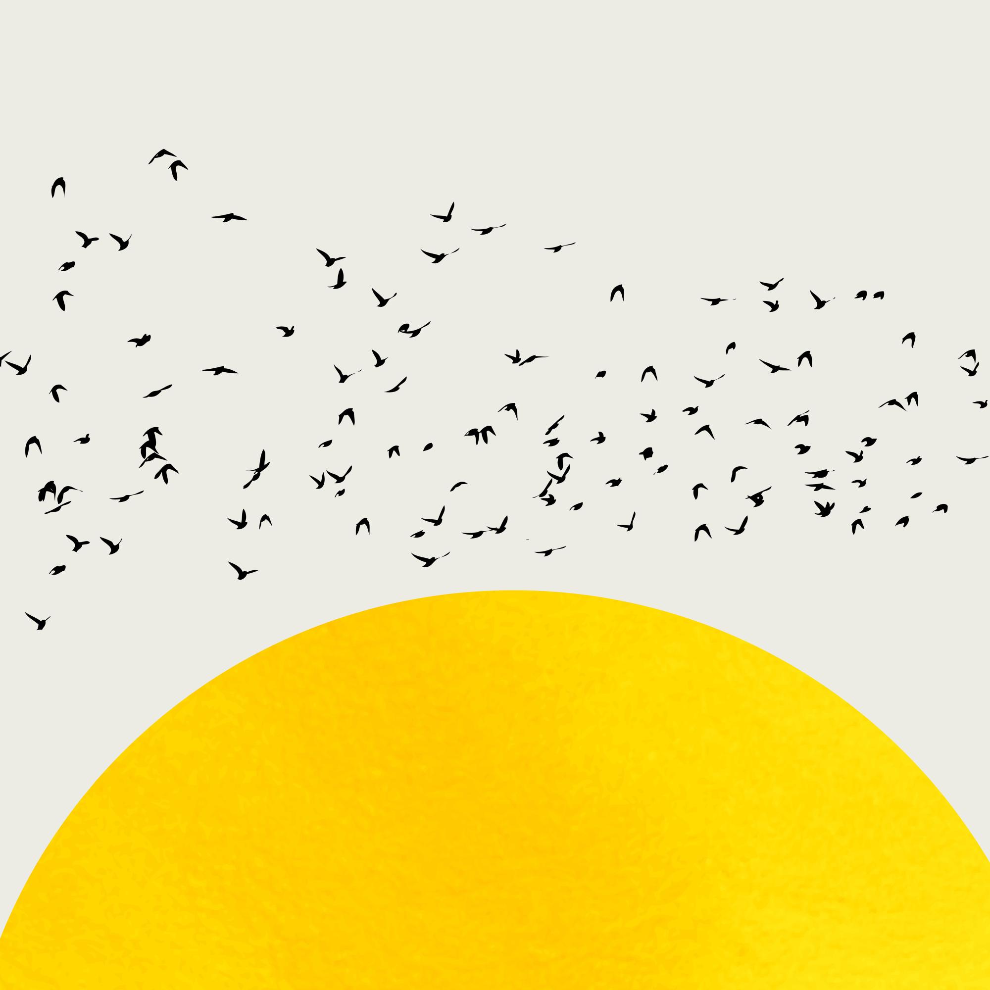 Poster raffigurante uno stormo di uccelli che volano un sole giallo brillante. Il sole splendente contrasta splendidamente con il cielo beige.