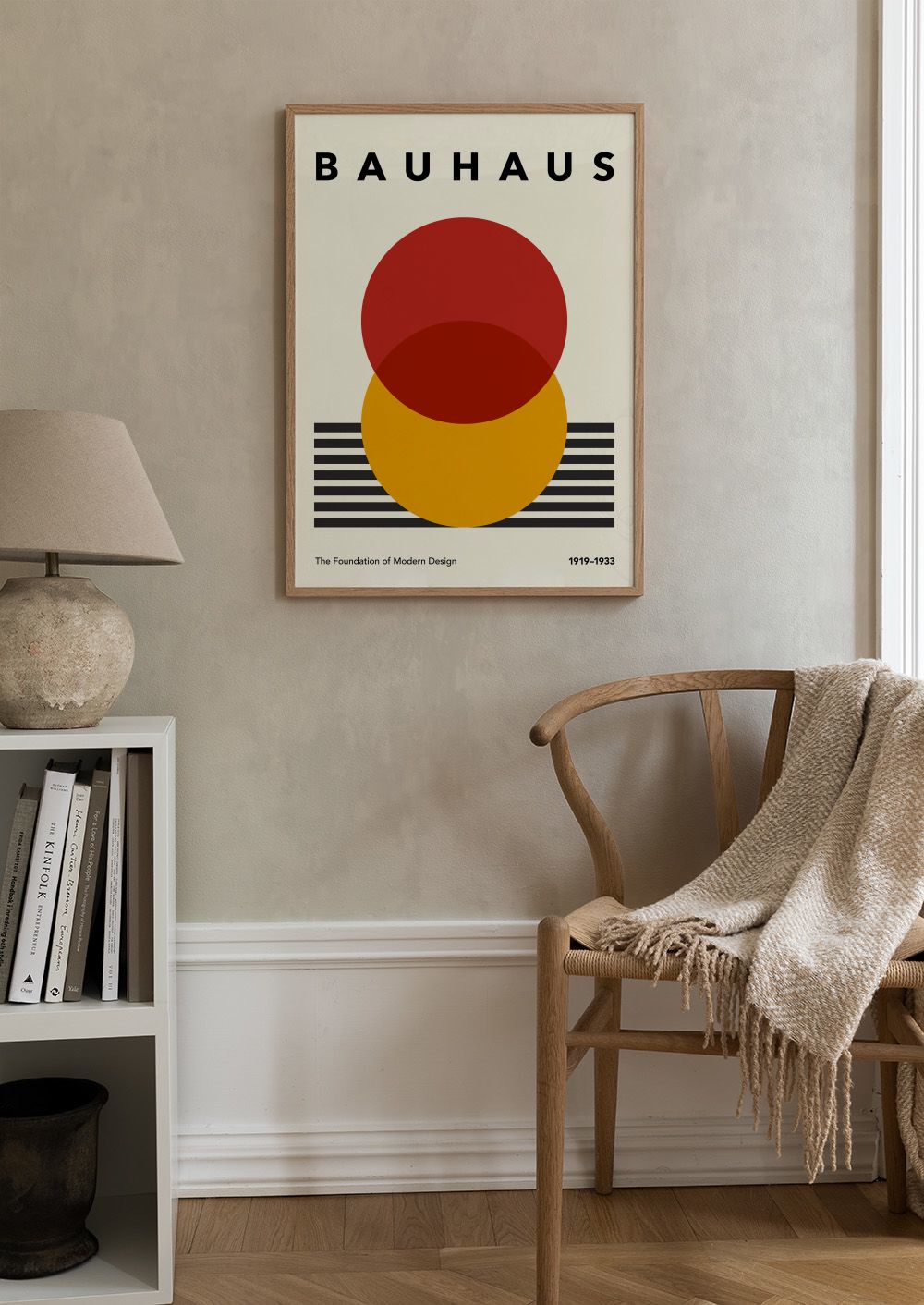 À partir de $21.60Une affiche inspirée du Bauhaus avec des cercles rouges et orange sur fond beige, parfaite pour une décoration moderne.