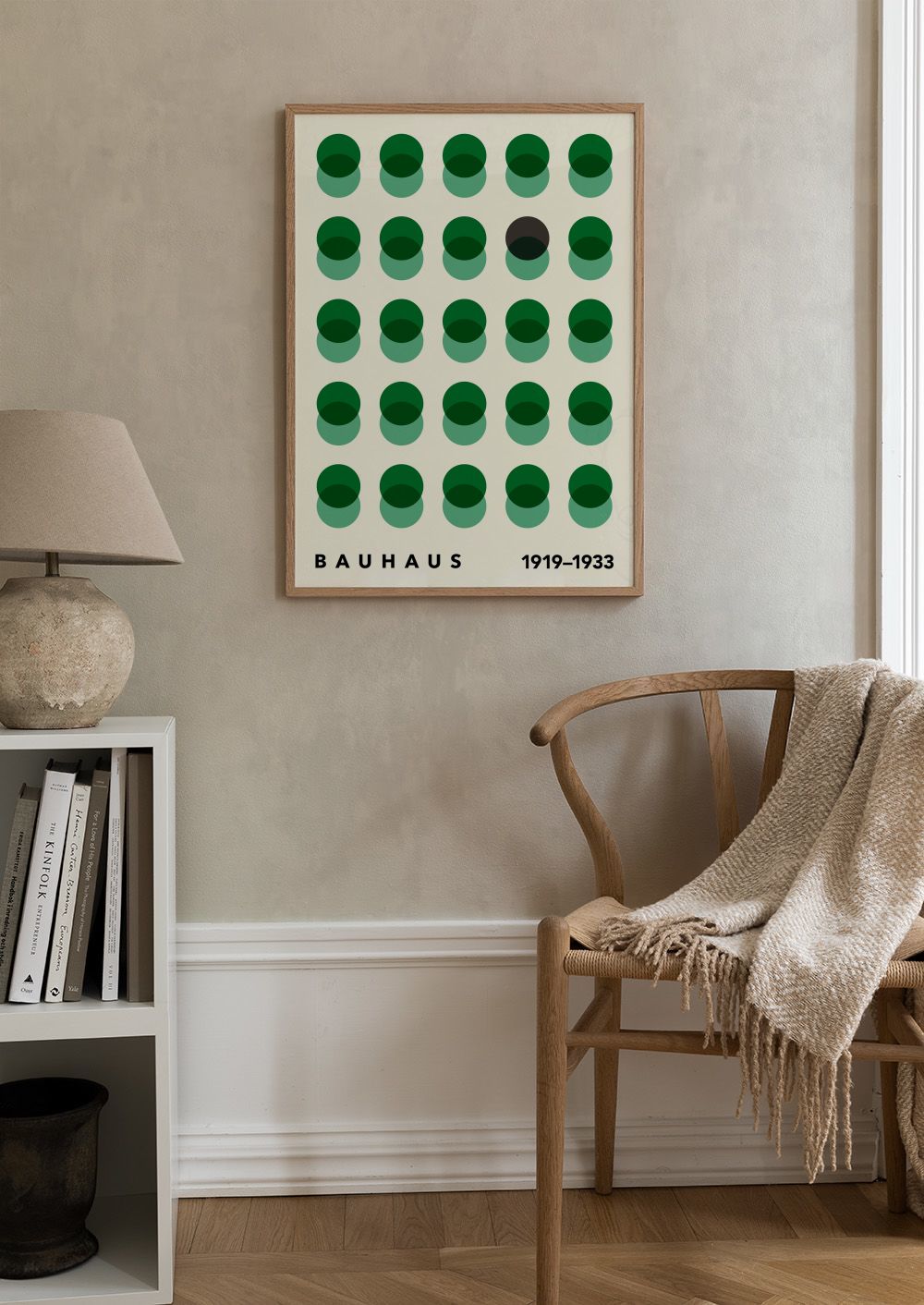 Une affiche inspirée du Bauhaus avec des cercles verts disposés en grille sur un fond clair.