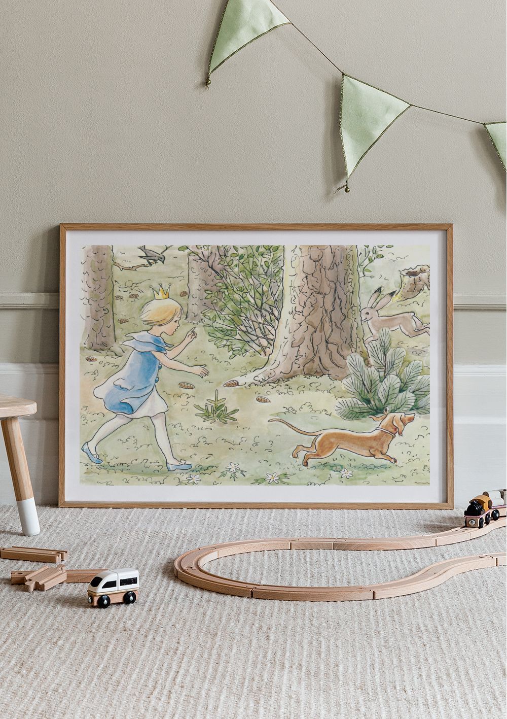Une affiche joyeuse montrant une petite princesse blonde qui court dans la forêt avec son chien et un lapin. Parfaite pour une chambre d'enfant.