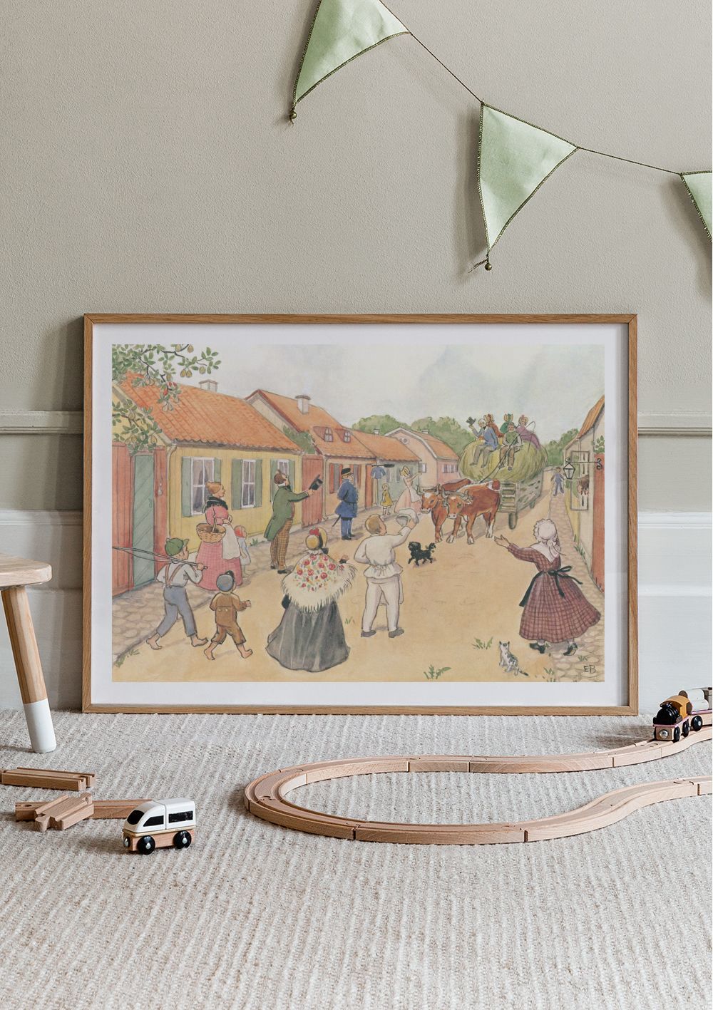 Une affiche joyeuse montrant des gens qui saluent un chariot tiré par des bœufs dans un village coloré avec des maisons aux toits orange.