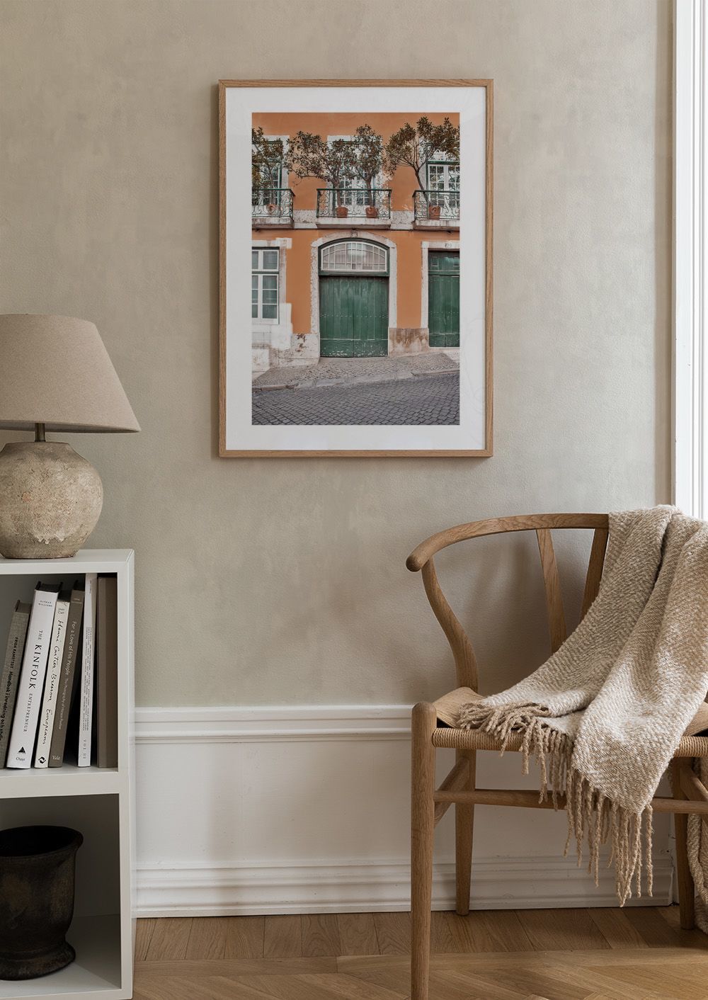 Une affiche charmante d'un bâtiment orange avec des portes vertes et des balcons fleuris à Lisbonne.
