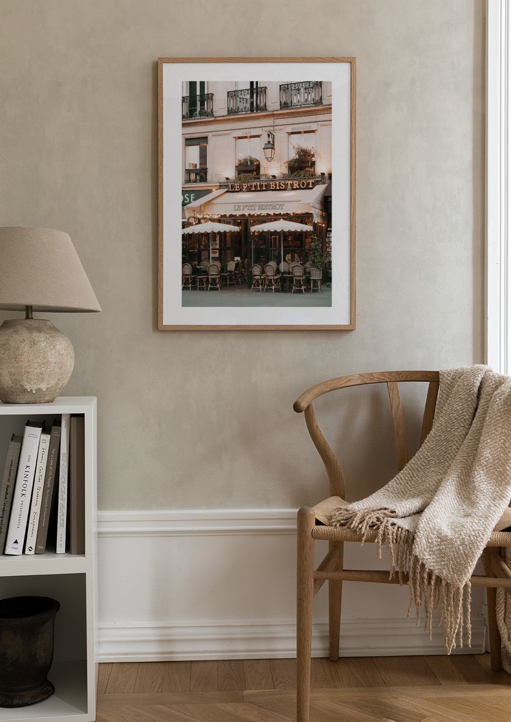 Créez une ambiance parisienne avec cette affiche qui présente un café charmant avec ses tables rondes et ses chaises en osier.