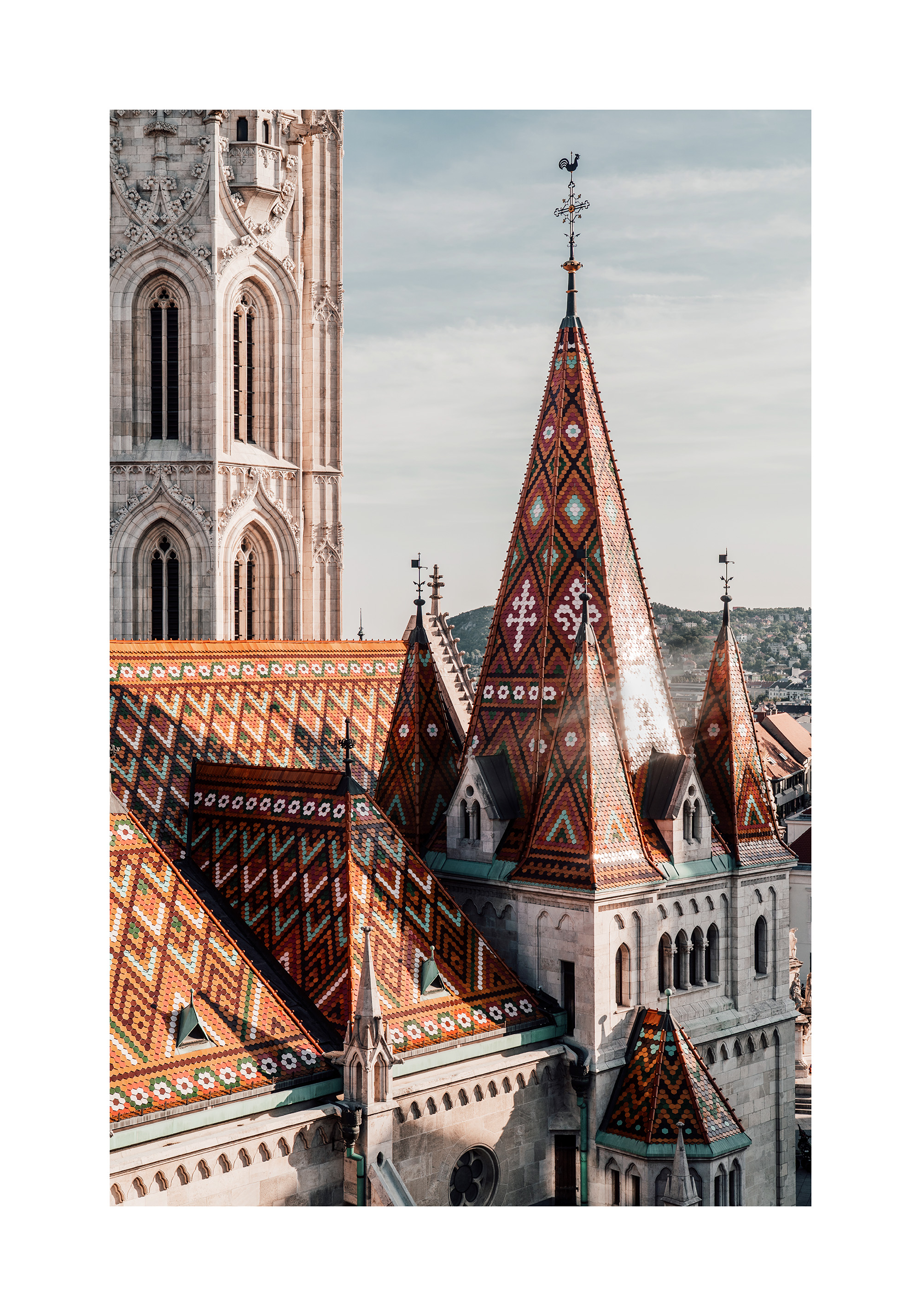 Une affiche colorée de Budapest avec ses toits uniques décorés de motifs géométriques en rouge, vert, jaune et blanc.