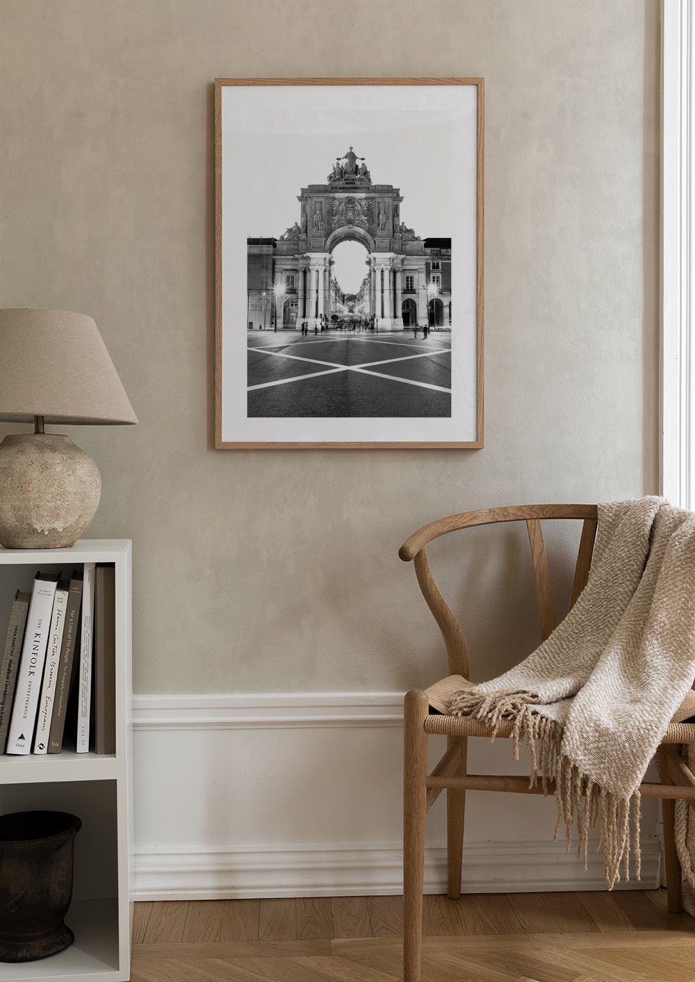 Une affiche en noir et blanc qui capture la beauté d'une arche monumentale à Lisbonne, parfaite pour une décoration élégante.