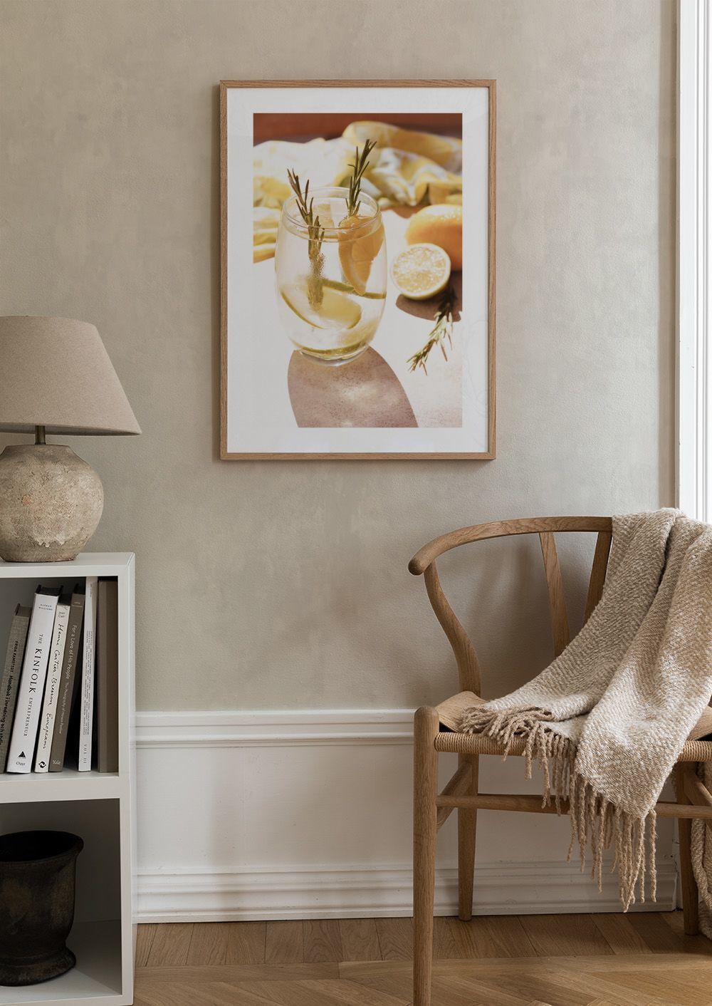 Une affiche rafraîchissante avec un verre d'eau glacée, du citron et du romarin, parfaite pour apporter une touche d'été à votre décoration.