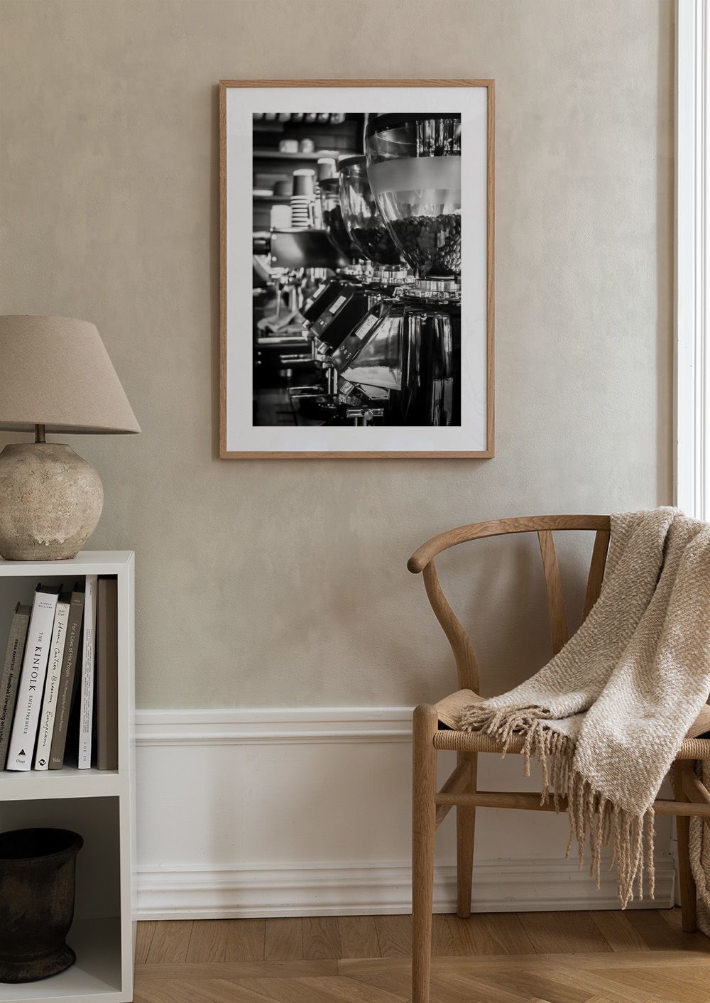 Une affiche en noir et blanc qui capture l'ambiance d'un café avec des moulins à café alignés et leurs contenants remplis de grains.