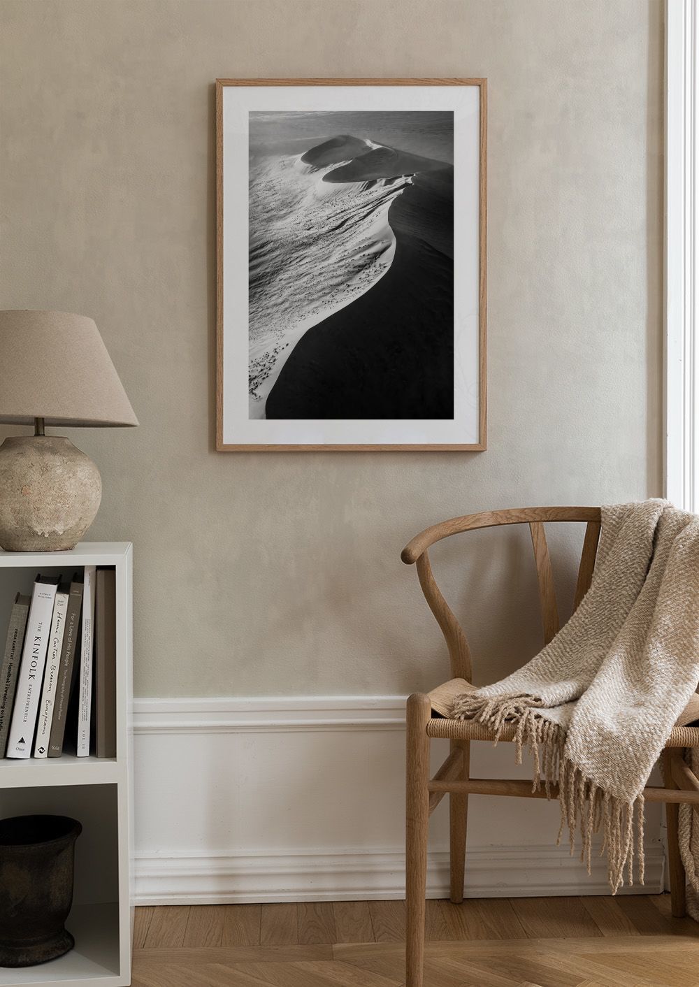 Une affiche en noir et blanc de dunes de sable aux formes douces et courbes, parfaite pour une décoration apaisante.