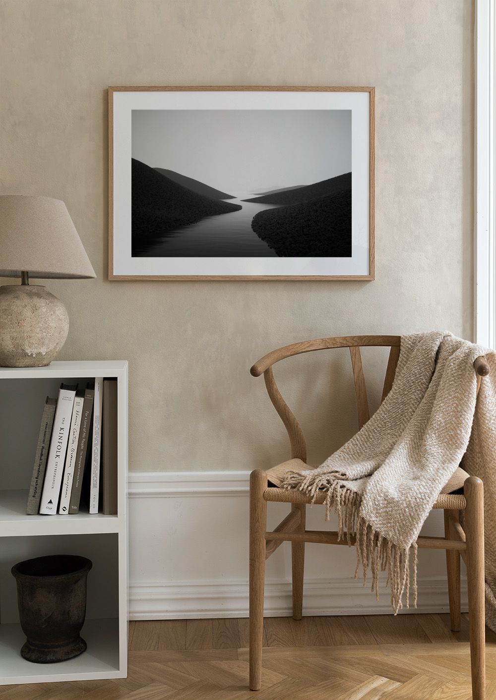 Une affiche en noir et blanc qui capture la beauté d'une rivière calme serpentant entre les collines, parfaite pour une décoration apaisante.