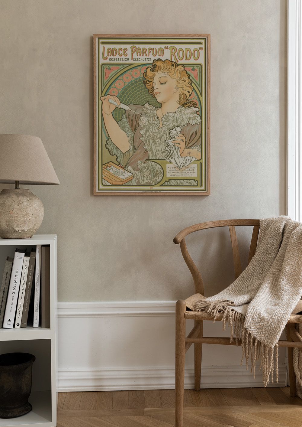 Une affiche inspirée de l'Art nouveau, avec une femme élégante tenant un vaporisateur de parfum Rodo, entourée de motifs floraux.