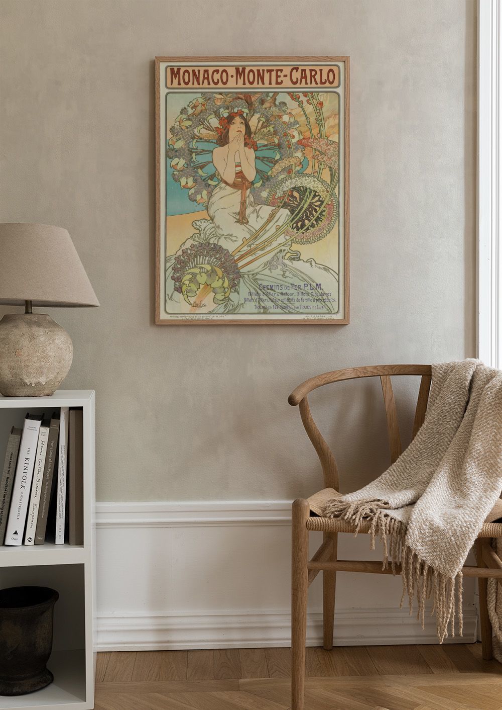 Une affiche inspirée de l'Art nouveau avec une femme entourée de fleurs colorées et de motifs élégants, parfaite pour apporter une touche artistique à votre maison.