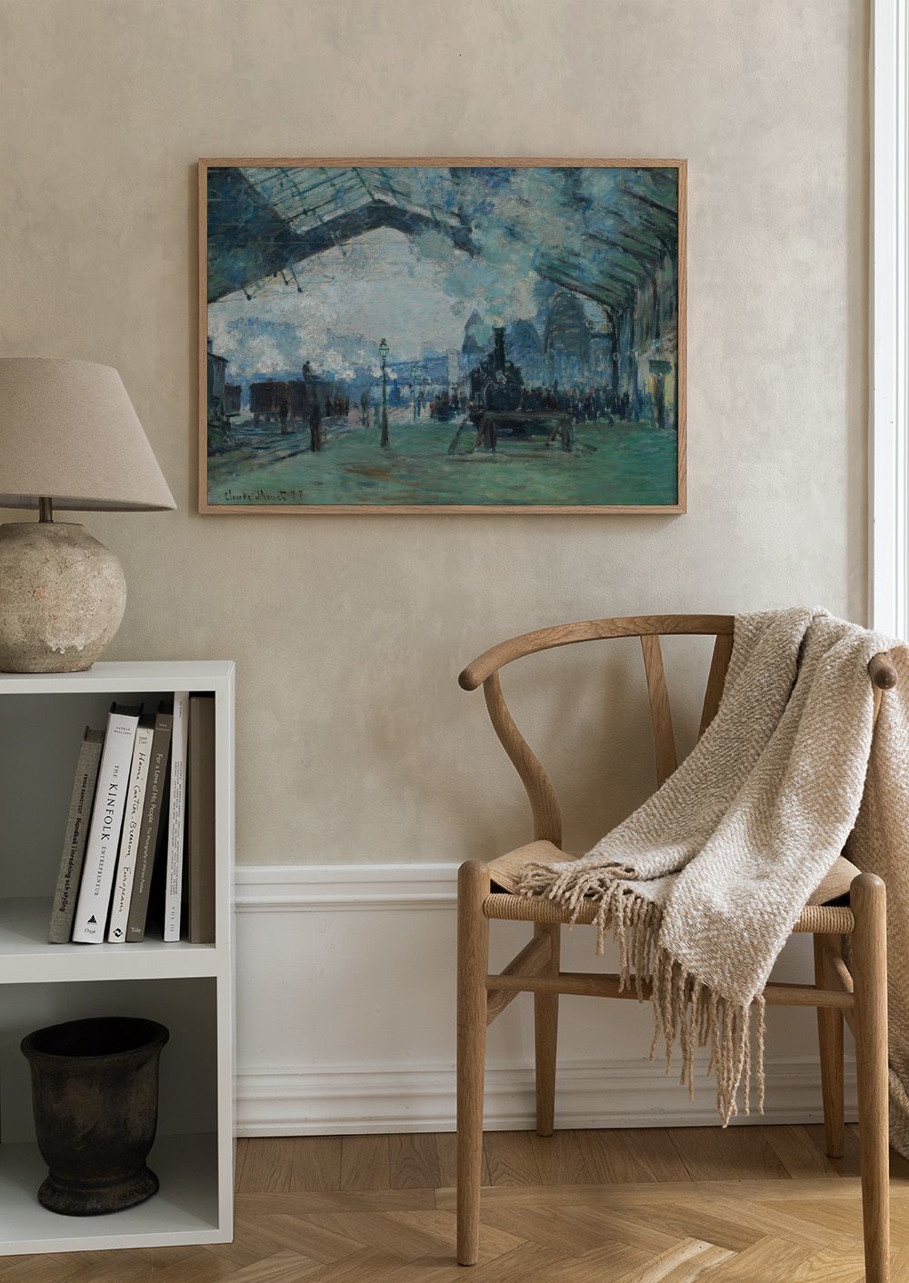 Une scène impressionniste d'une gare avec un train à vapeur sous un toit en verre. La fumée remplit l'air dans des tons bleus et gris.