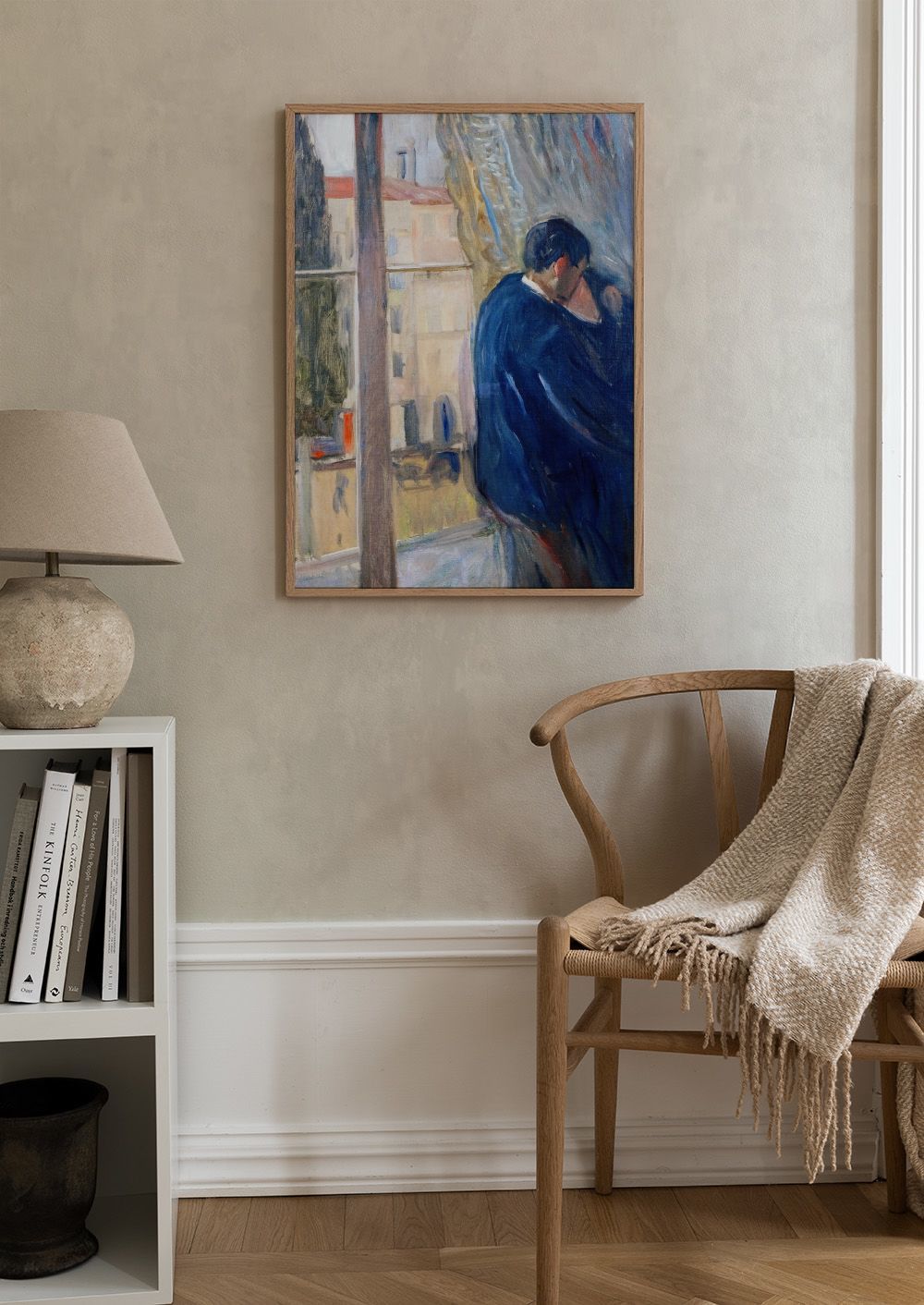 À partir de $21.60Une affiche romantique inspirée d'Edvard Munch, montrant un couple qui s'embrasse près d'une fenêtre avec des couleurs douces et des arbres en arrière-plan.