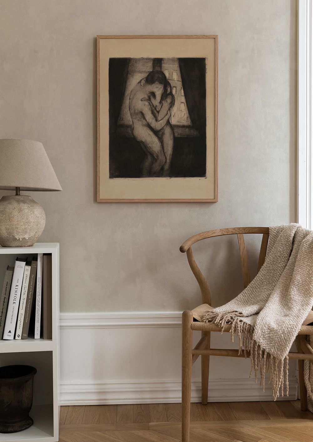 Une affiche intime montrant deux personnes qui s'enlacent devant une fenêtre, dans des tons noirs et beiges avec un style esquissé et doux.