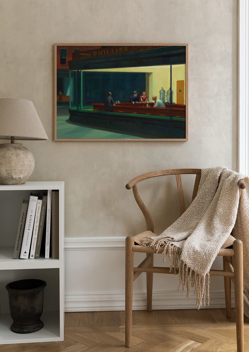Une affiche inspirée du célèbre tableau de Edward Hopper montrant un restaurant la nuit avec de grandes fenêtres et une lumière chaude à l'intérieur.