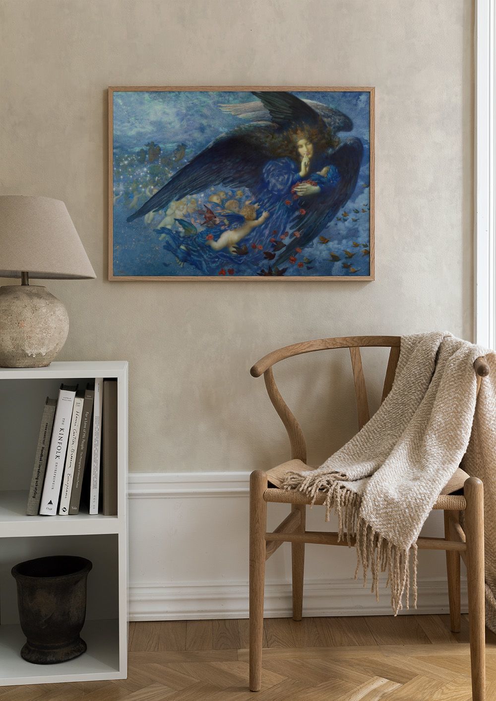 Une affiche céleste avec une figure ailée portant une couronne et entourée de petits anges aux ailes bleues, d'étoiles scintillantes et de fleurs rouges.