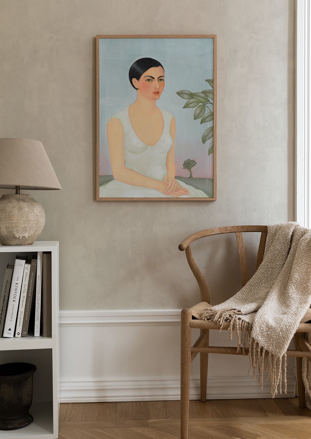 Une affiche représentant une femme aux yeux verts vêtue d'une robe blanche, avec des feuilles vertes en arrière-plan.