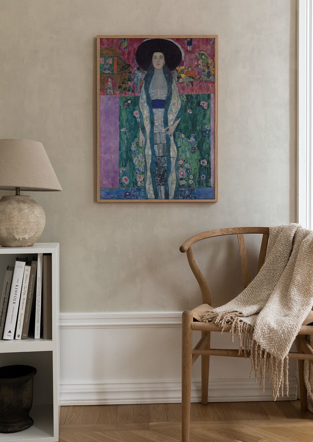 Une affiche inspirée de Klimt avec une femme en robe ornée de motifs colorés et floraux.