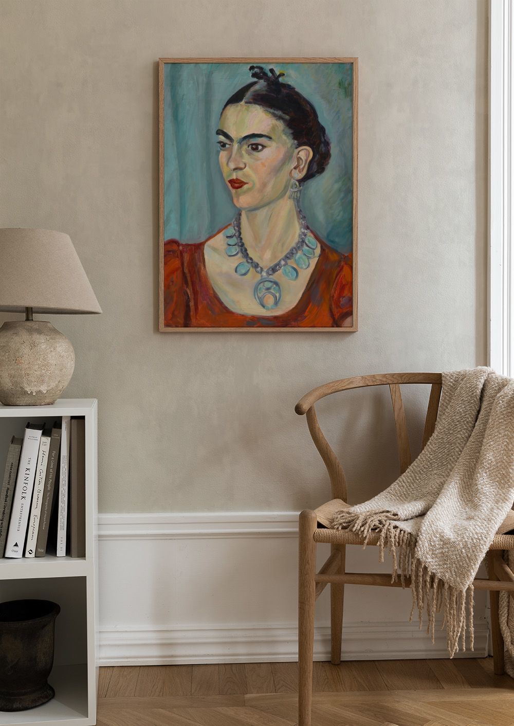 À partir de $21.60Une affiche vibrante représentant un portrait expressif aux sourcils marqués et lèvres rouges, ornée de bijoux bleus éclatants sur fond coloré.