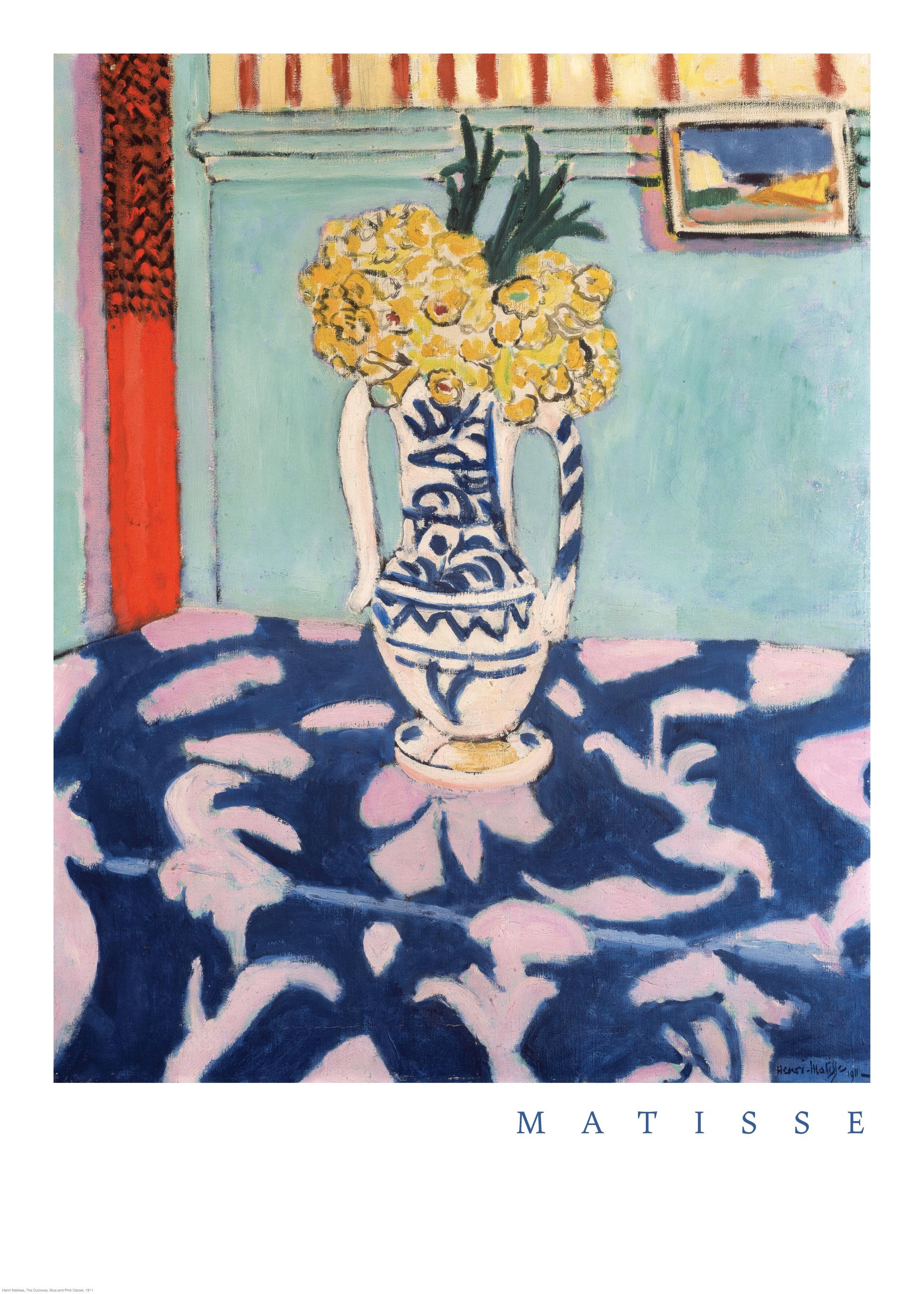 Une affiche inspirée de Matisse avec un vase bleu et blanc rempli de fleurs jaunes éclatantes.