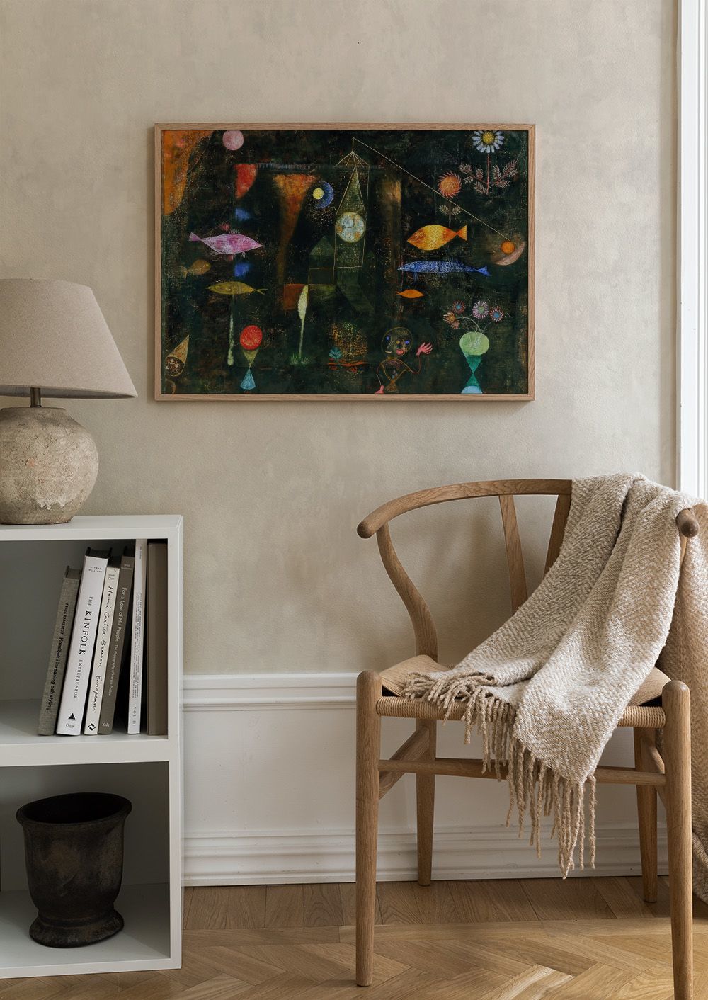 À partir de $21.60Une affiche colorée inspirée de l'œuvre de Paul Klee, avec des poissons roses, jaunes et bleus qui nagent dans un espace sombre et mystérieux.