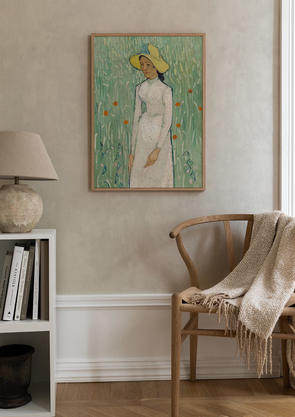 Une affiche inspirée de Van Gogh montrant une femme en robe blanche dans un champ fleuri, parfaite pour ajouter une touche artistique à votre décor.