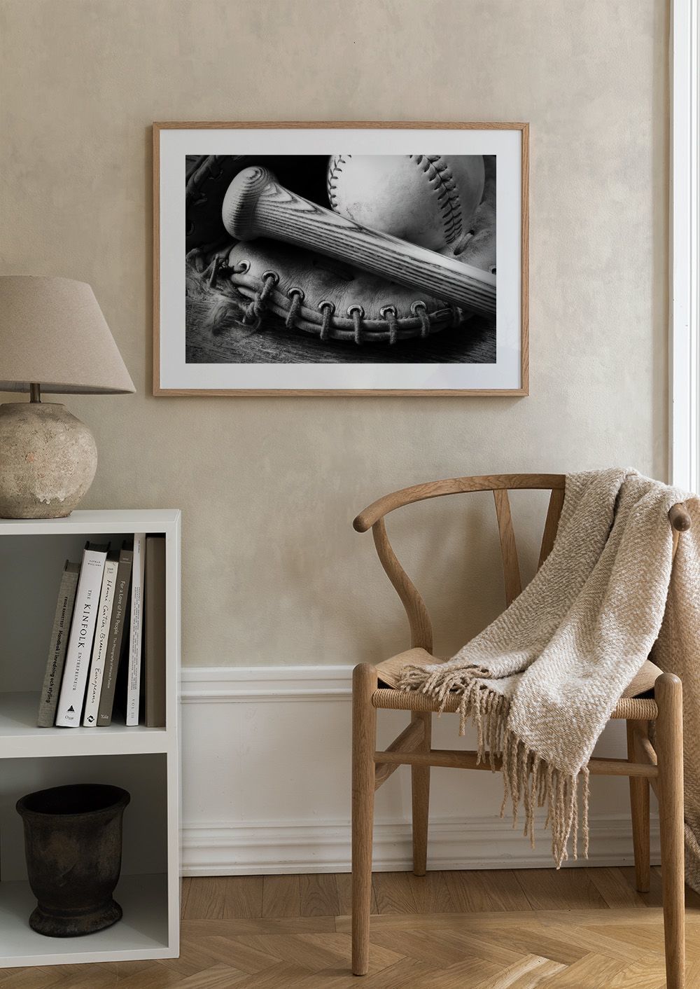 Une affiche en noir et blanc qui capture l'esprit du baseball avec une batte, un gant et une balle pour les fans de sport.