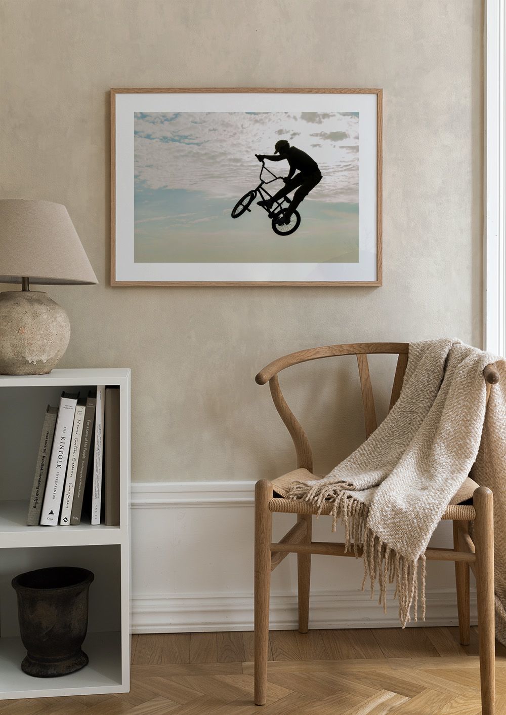Un cycliste en plein saut capturé contre un ciel bleu lumineux. Une affiche dynamique parfaite pour les amateurs de vélo et d'aventure.
