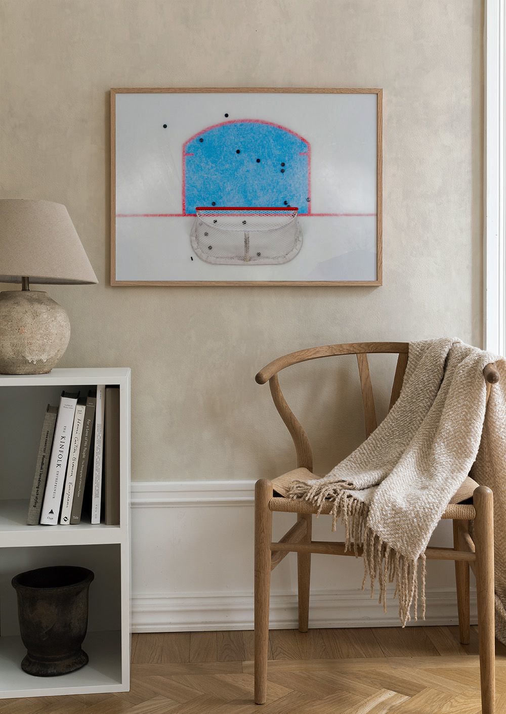 Une affiche de hockey sur glace avec un filet blanc et des rondelles noires, parfaite pour les amateurs de sport.