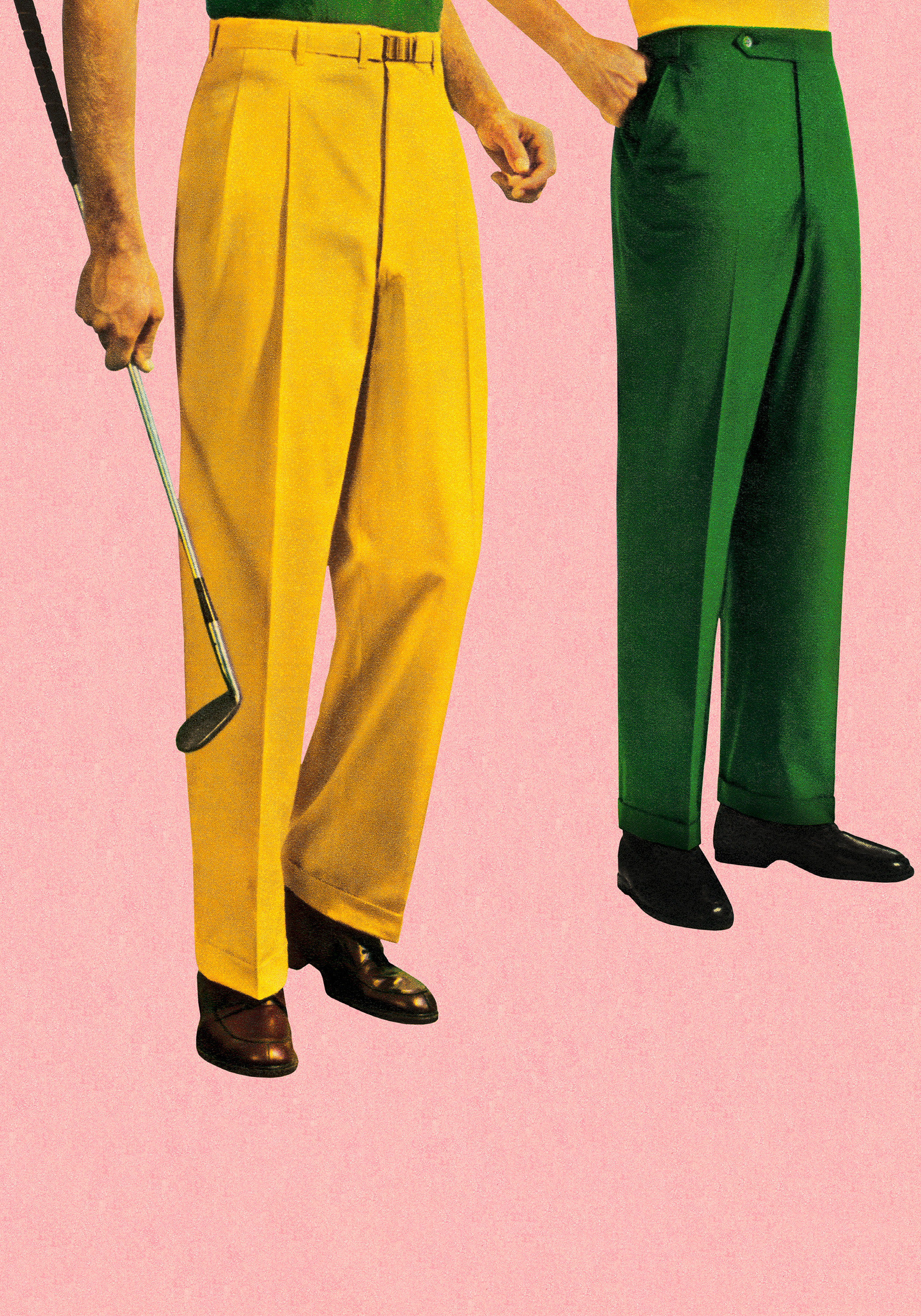 Une affiche moderne avec deux personnages stylisés sur fond rose, vêtus de pantalons jaune et vert aux couleurs vives.