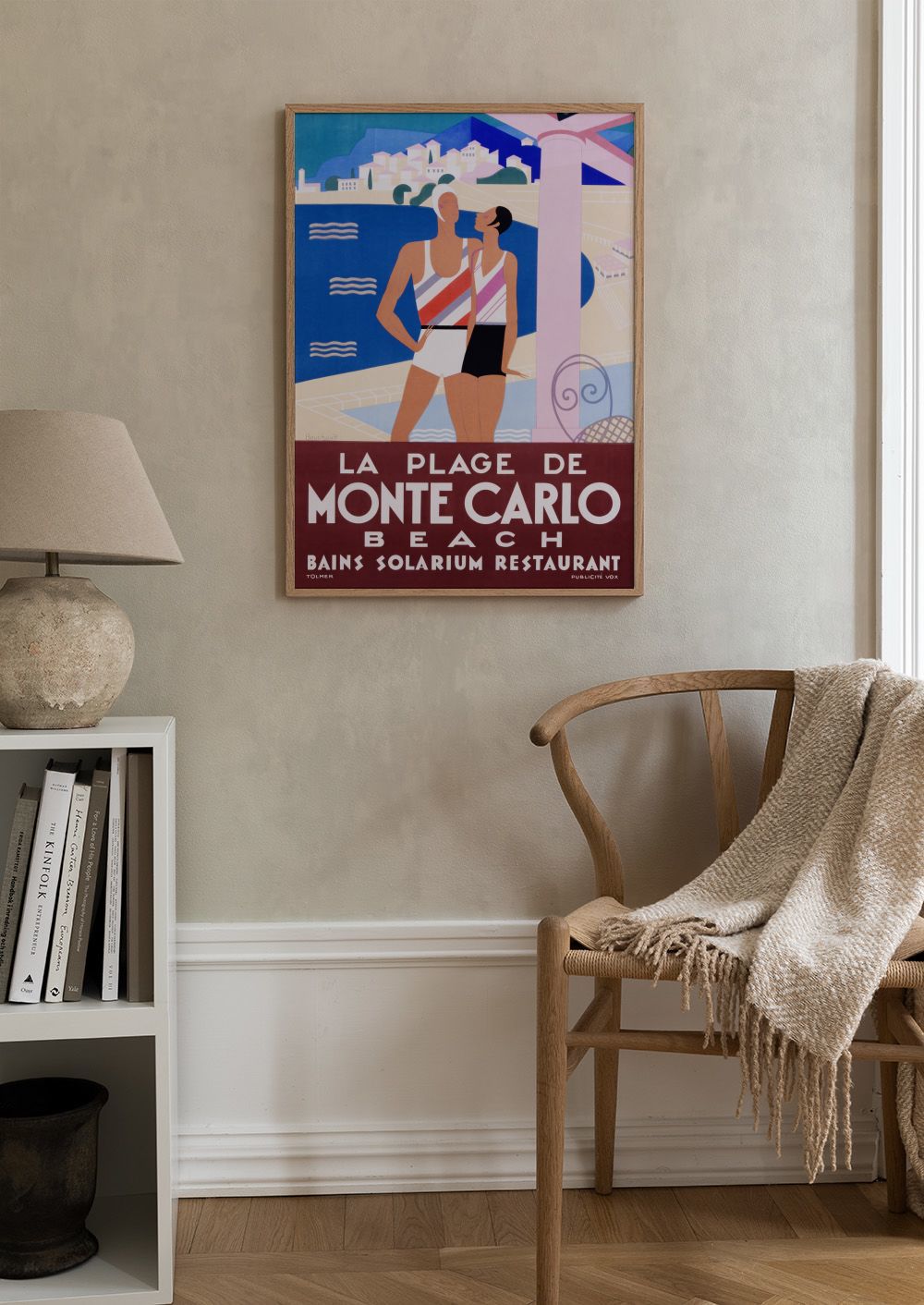 Une affiche colorée de Monte-Carlo Beach avec des rayures rouges, blanches et noires au bord de la mer bleue.