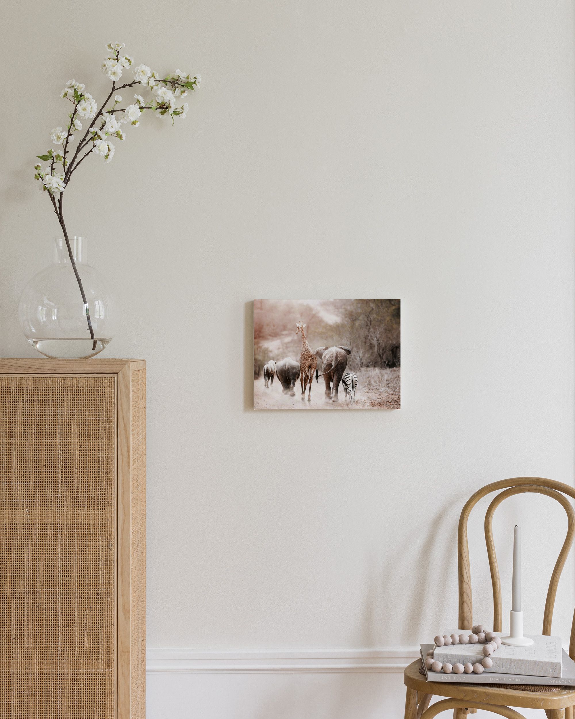 Cette affiche montre une belle scène d'amitié avec une girafe, des éléphants, un zèbre et un rhinocéros qui marchent ensemble sur un chemin dans la savane africaine.