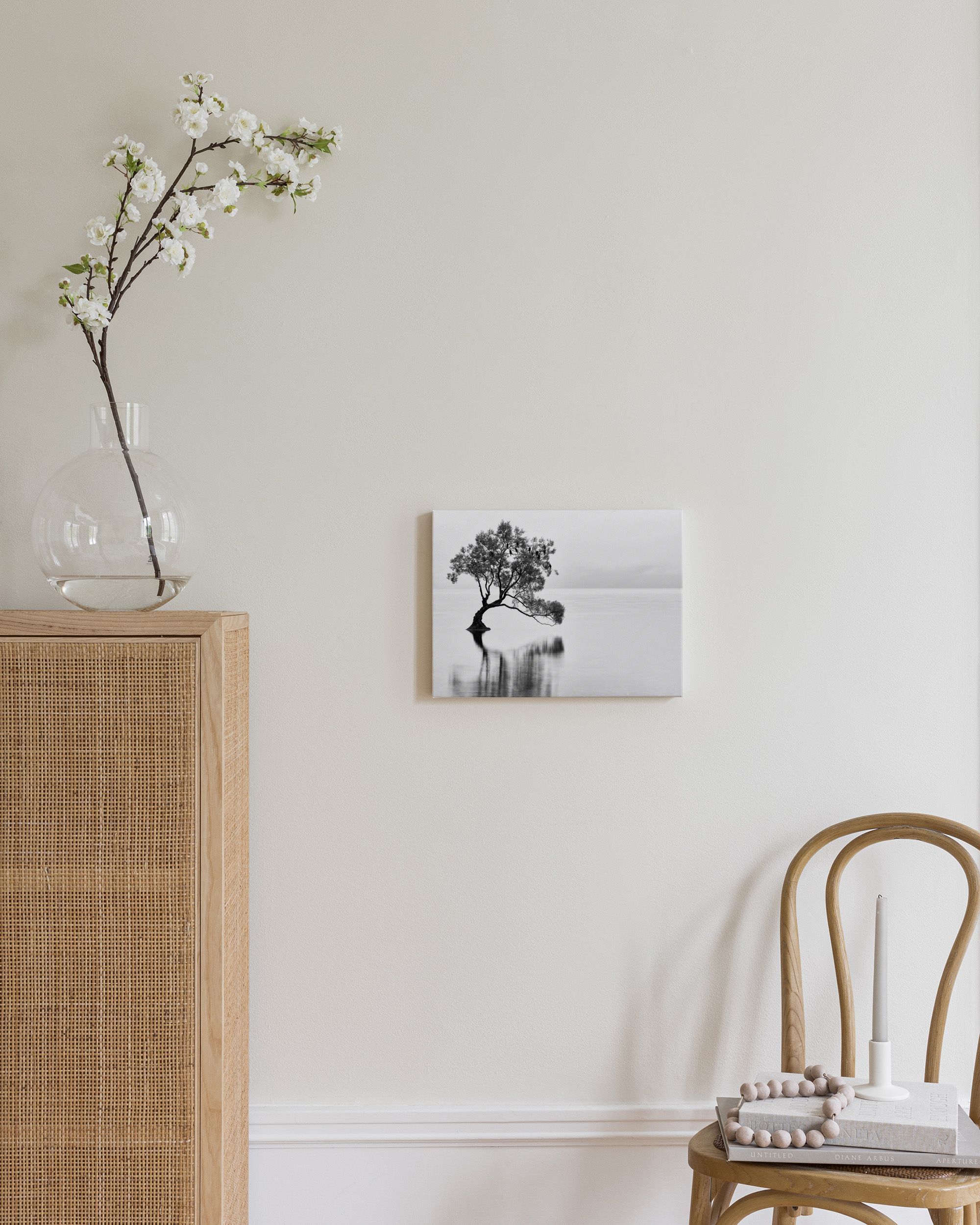 À partir de $69.13Un arbre solitaire se dresse dans une eau calme. Cette image en noir et blanc montre les branches étalées avec des feuilles et leur reflet dans l'eau. Le ciel et l'eau sont lisses, créant une scène paisible.