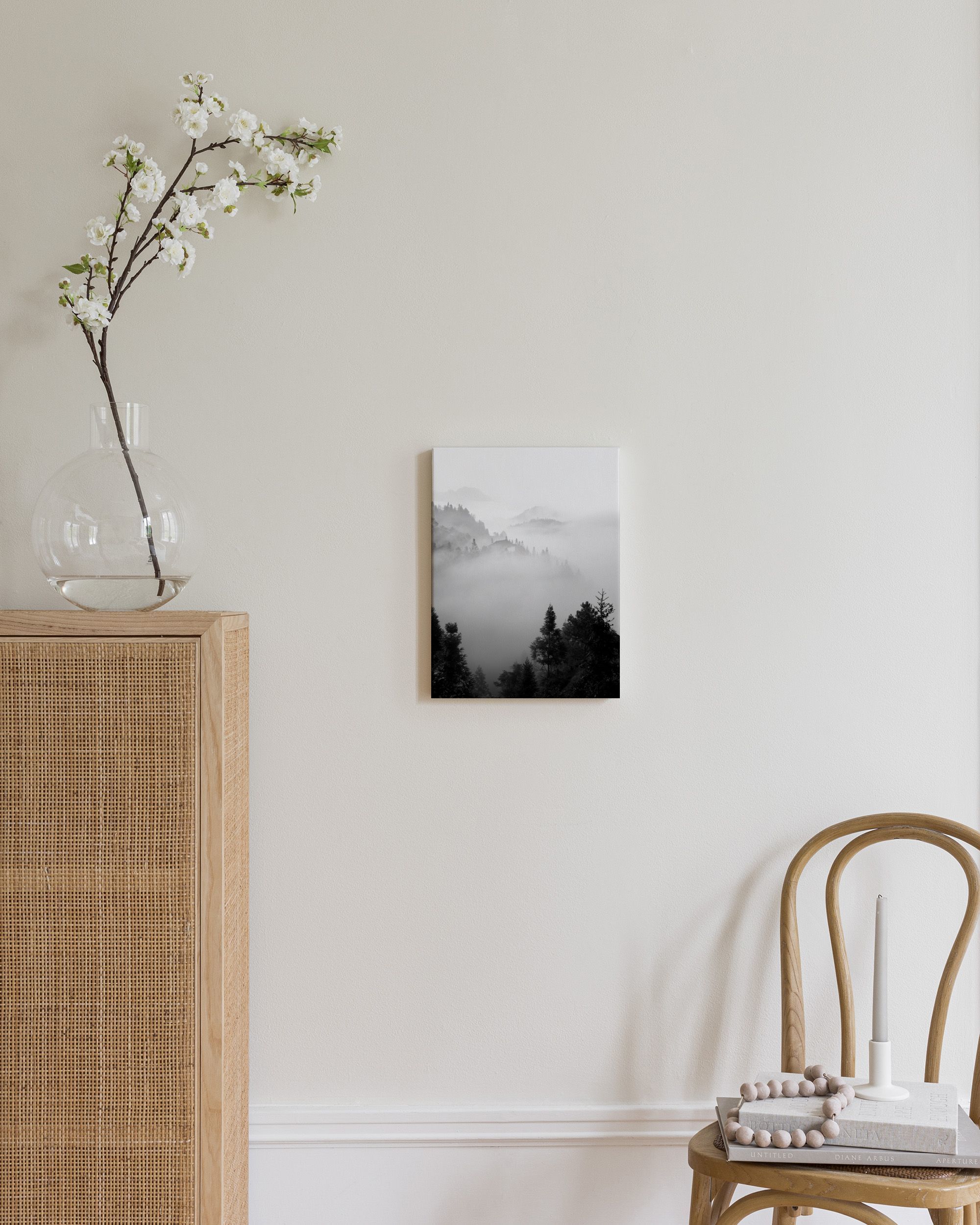 Plongez dans la beauté d'un paysage brumeux en noir et blanc, où les collines et les arbres se mélangent dans un brouillard doux et mystérieux. Ce tableau apporte une touche élégante à votre décoration.
