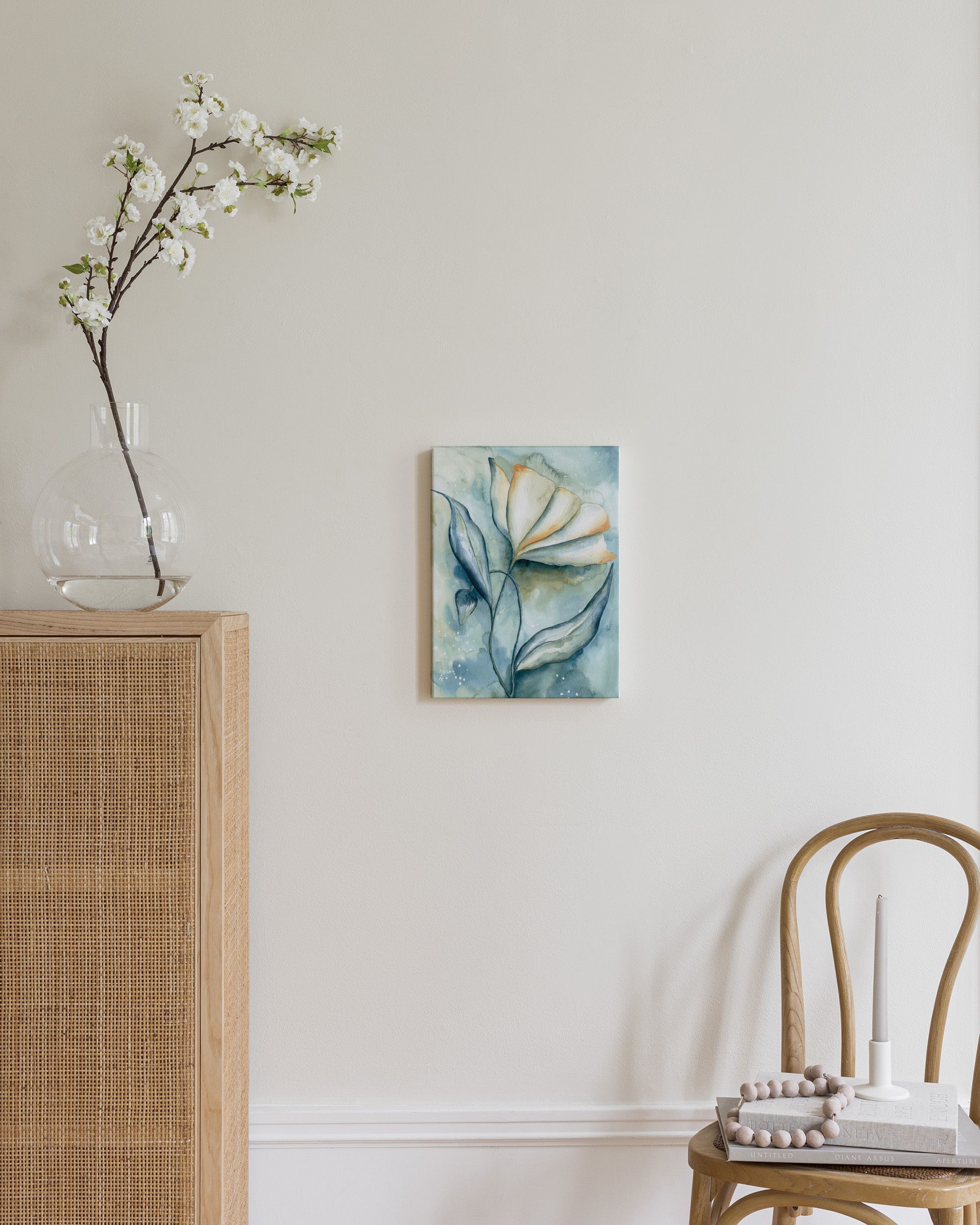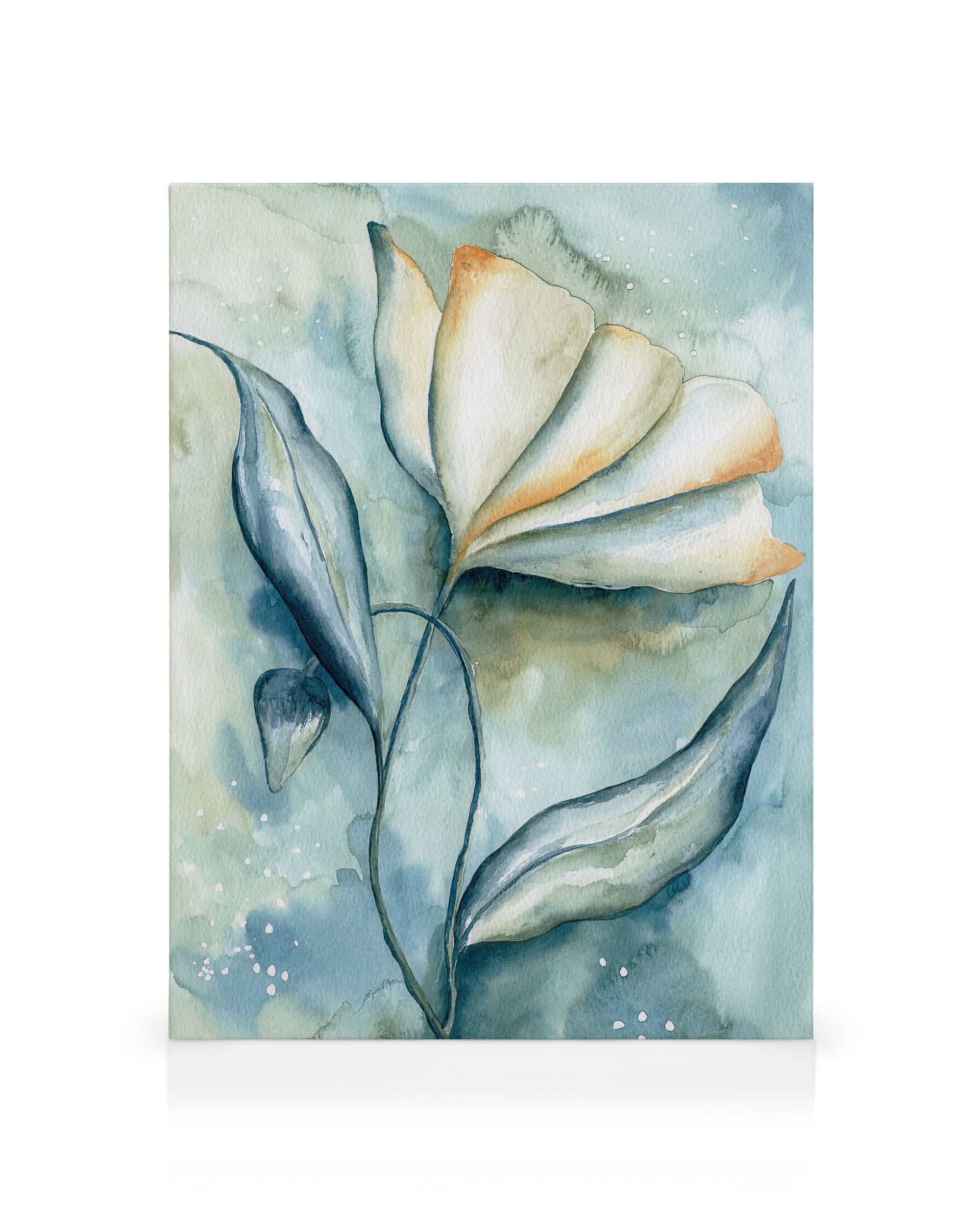 Watercolour canvas print of an abstract blue flower with orange tips and green leaves on a soft blue background.
