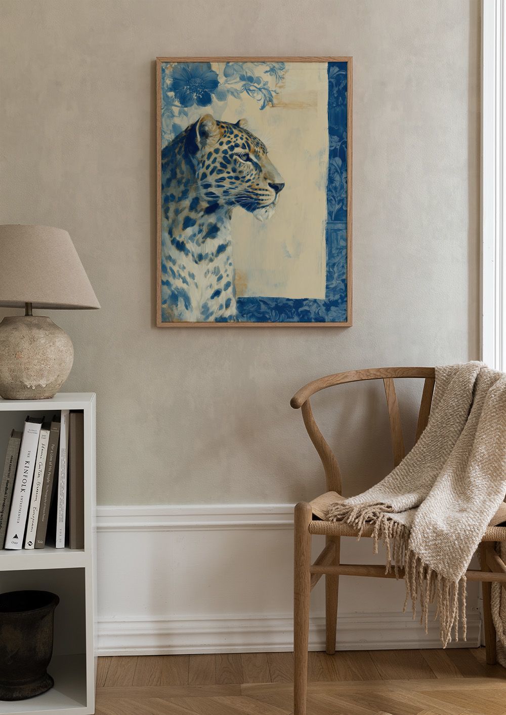 From $69.13A print of a leopard with blue spots and fur against a cream and blue background with floral patterns and a large blue flower.