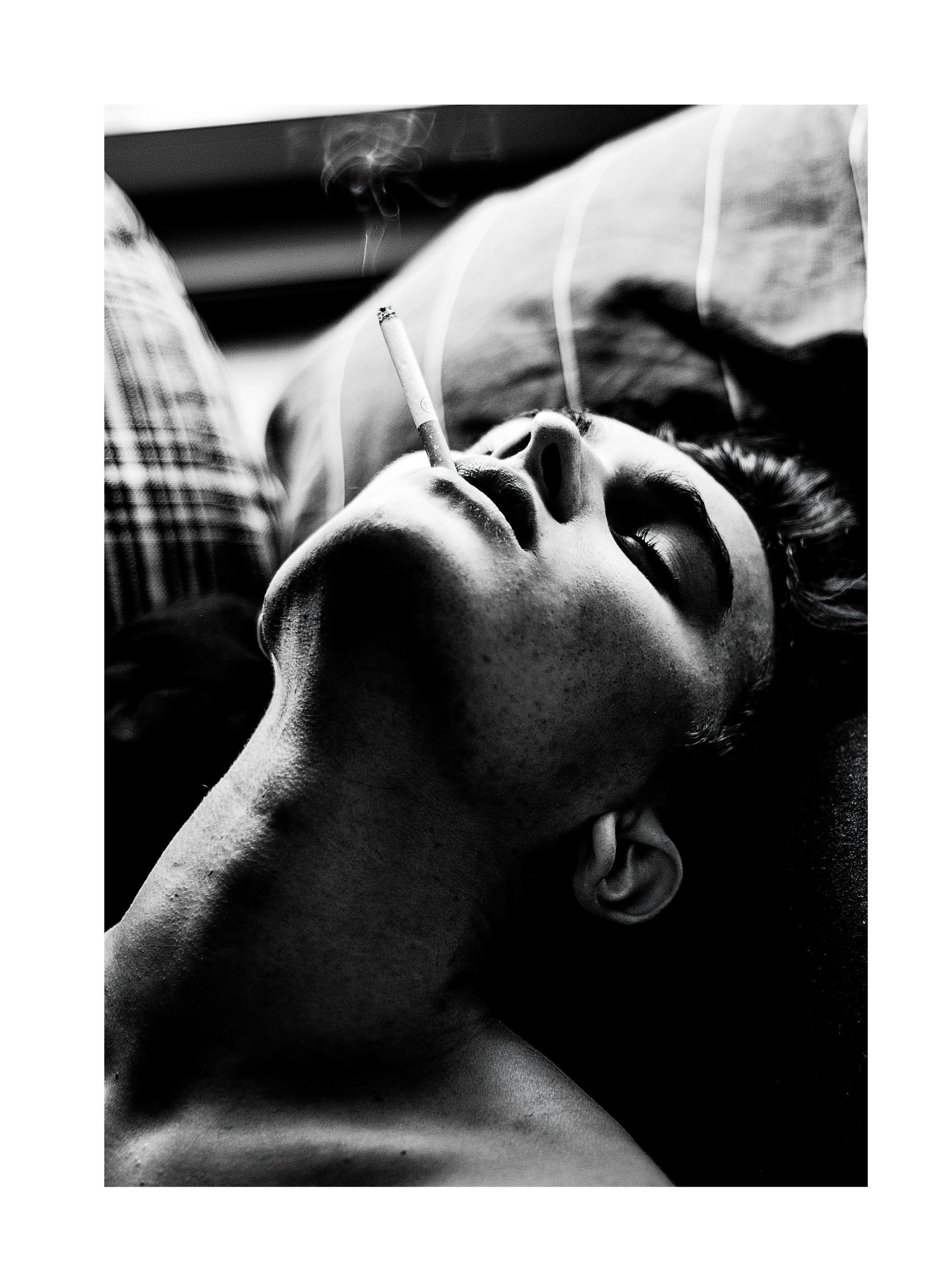 A cool black and white photo art print of a handsome, young man closing his eyes and leaning his head back whilst smoking a cigarette. If tranquillity were to be imaged, this would definitely be it!