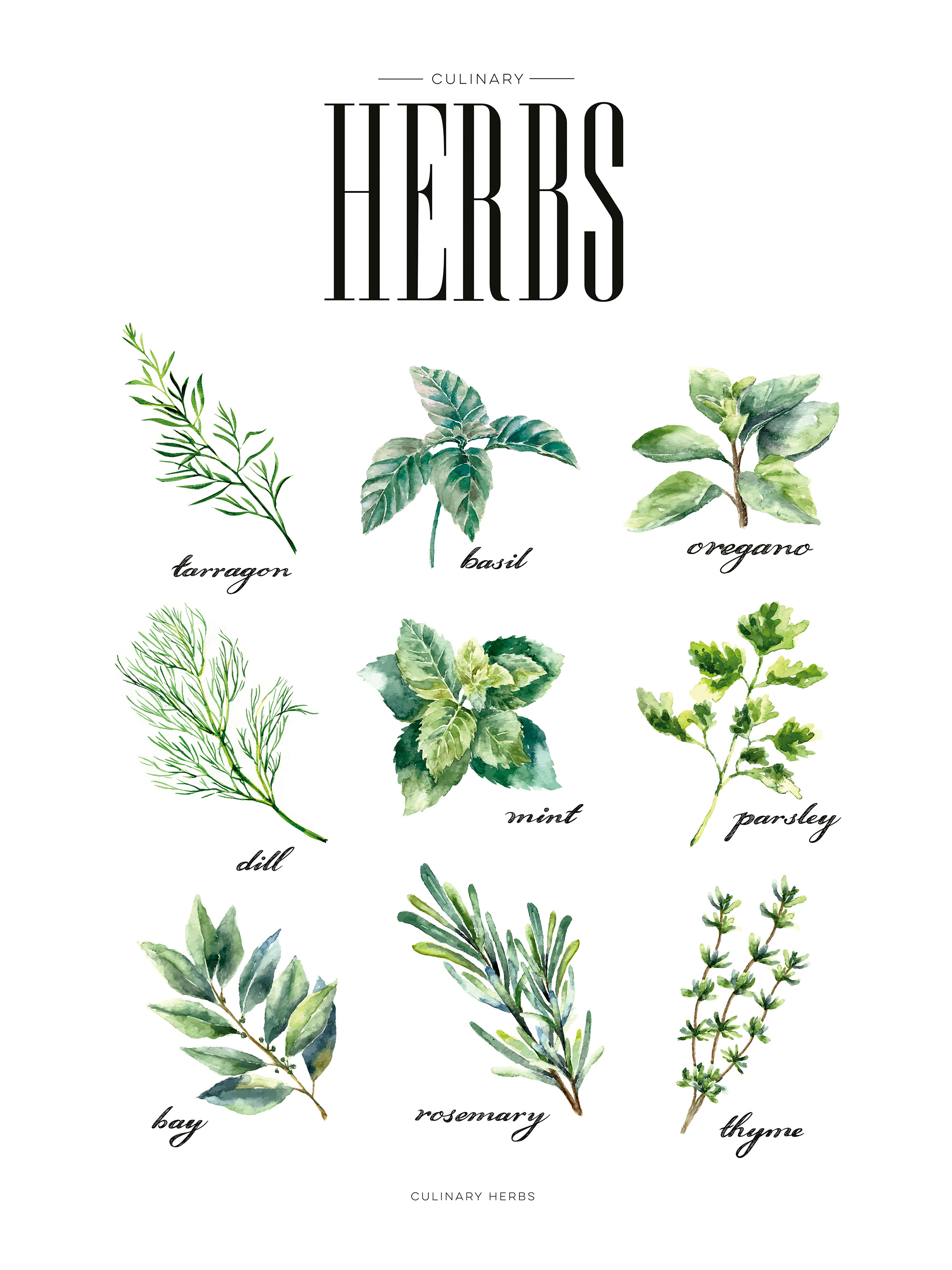 From $25.20A print illustrating nine green herbs with labels: tarragon, basil, oregano, dill, mint, parsley, bay, rosemary, and thyme. Perfect wall art for your kitchen!