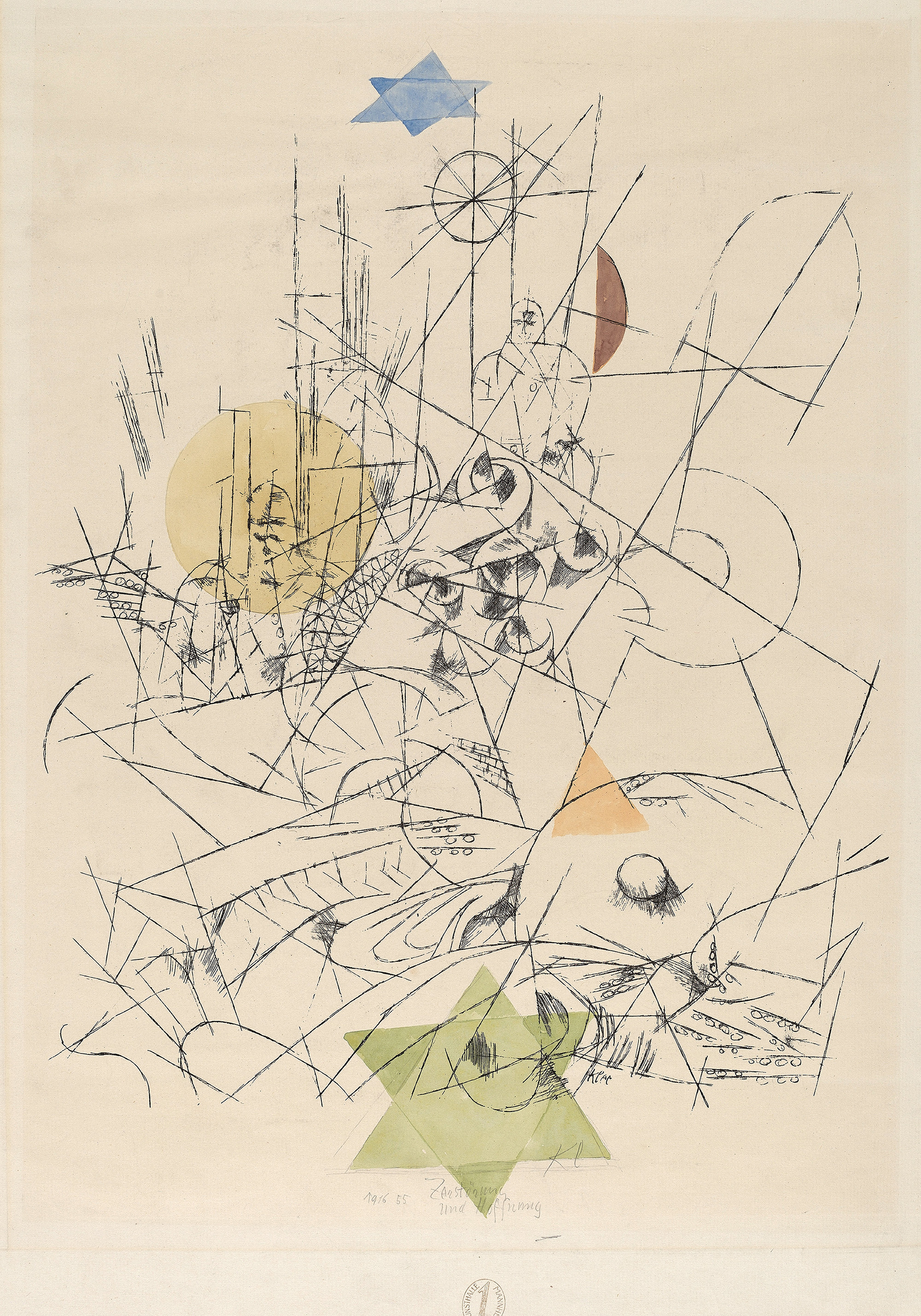 A print featuring abstract shapes like circles, stars, and triangles in yellow, red, blue, green, and orange with thin black lines crossing each other on a light beige background.