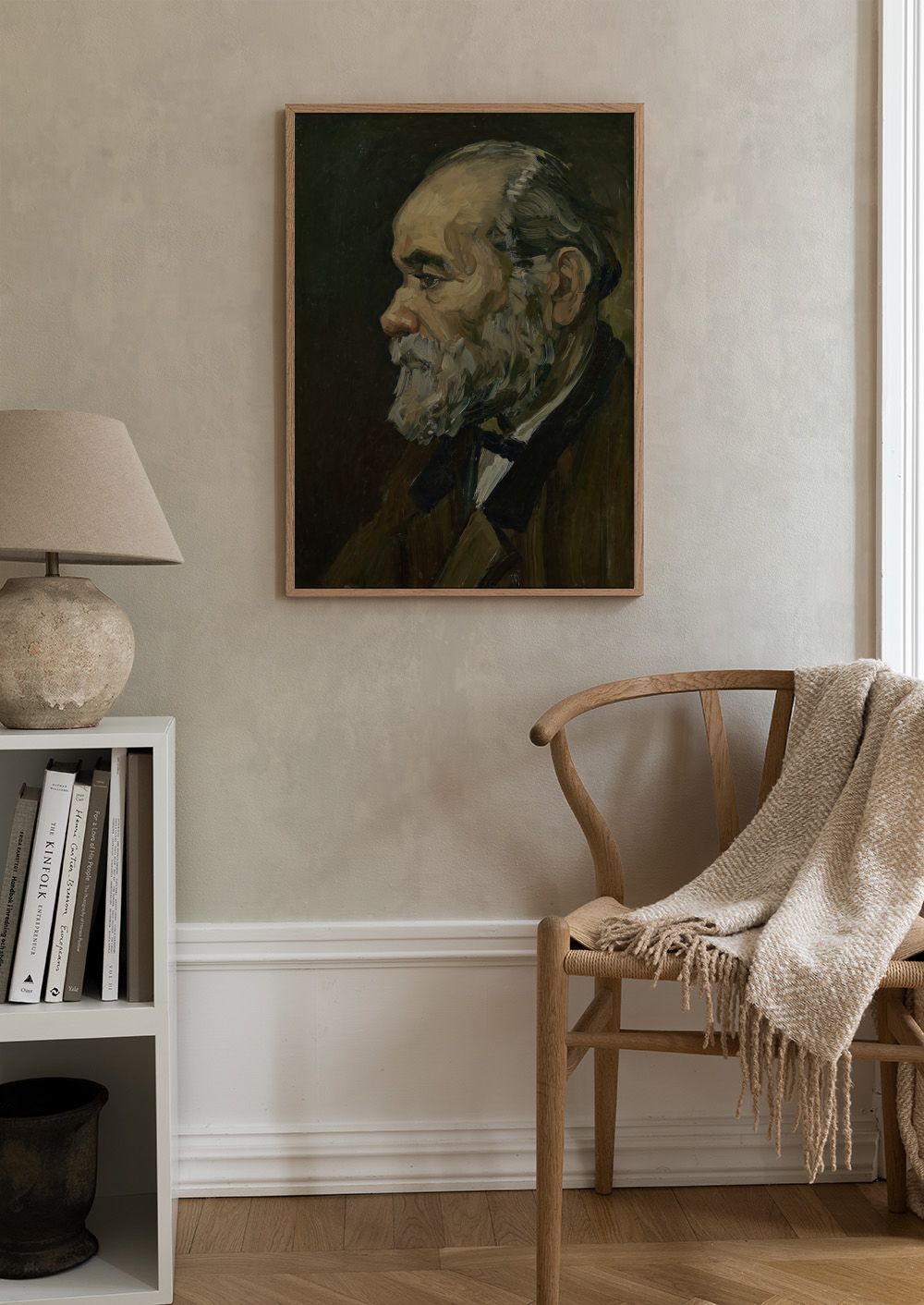 A print of an older man with a grey beard, painted in browns, whites and greys. This portrait by Vincent Van Gogh has a textured brush-stroke style.