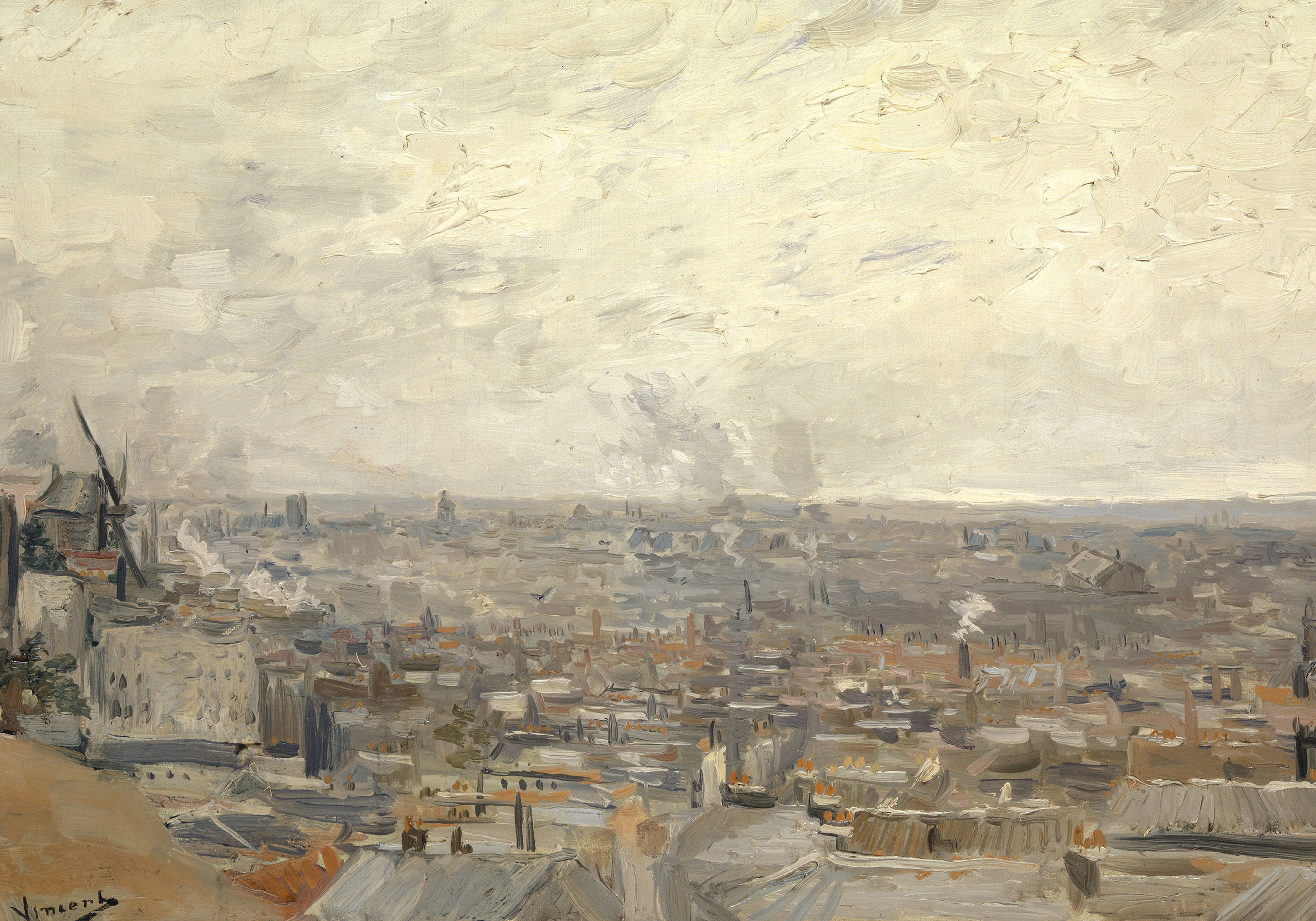 A print of a cityscape painting by Vincent Van Gogh, showing buildings in grey and brown tones with a windmill on the left under a cloudy sky.
