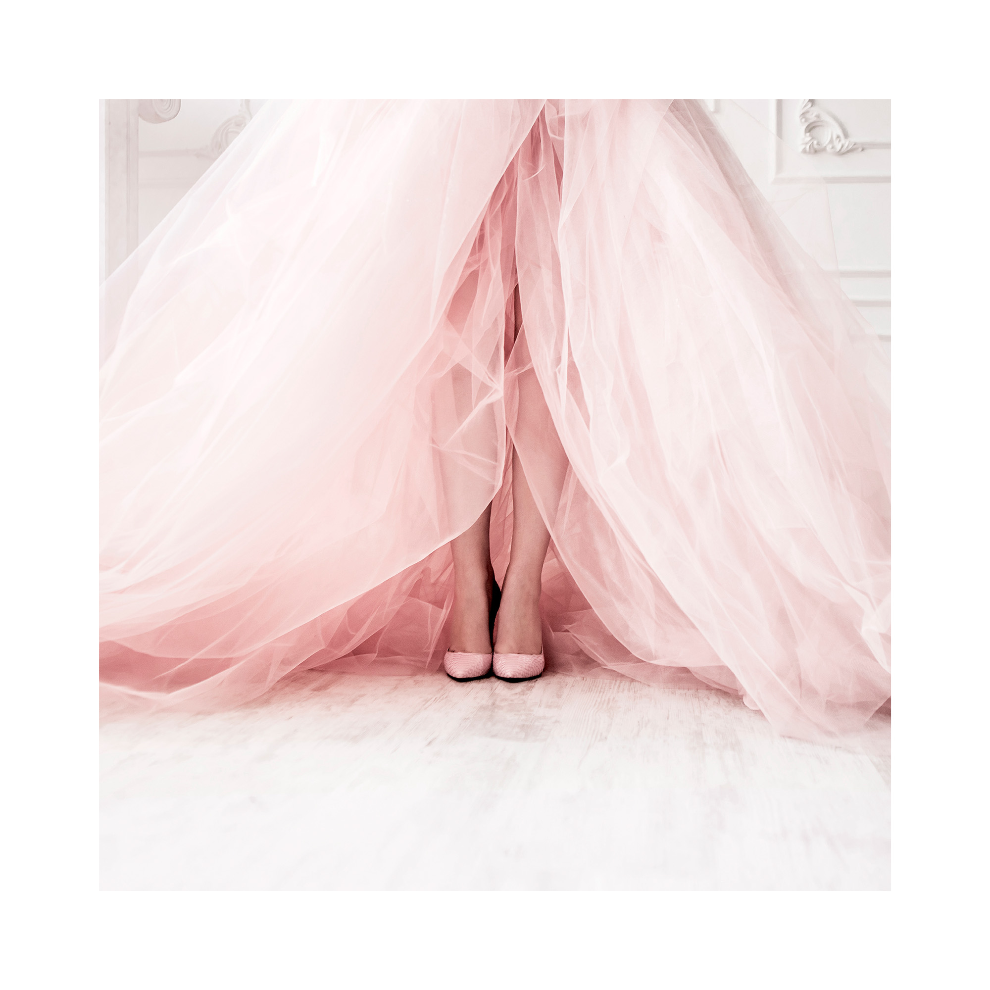Elegant print of a woman with a stunning pink dress and high heels in front of an ornate white wooden door. Have you ever dreamed of being a princess and wearing such a gorgeous dress? The print has a printed white margin that frames the design.