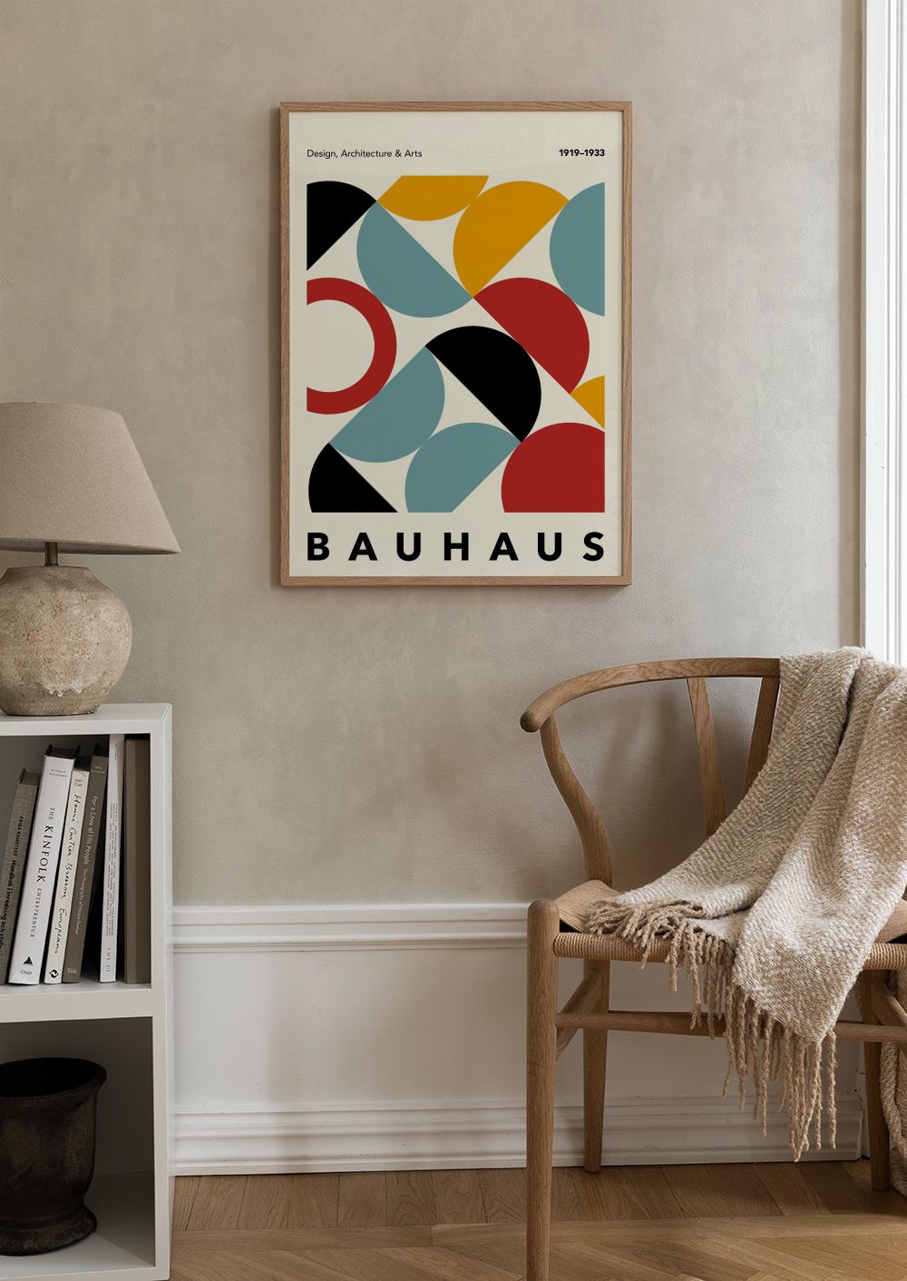 From $21.60A print with colourful geometric shapes in red, blue, yellow, black, and white on a cream background. Perfect wall art for lovers of design and architecture.