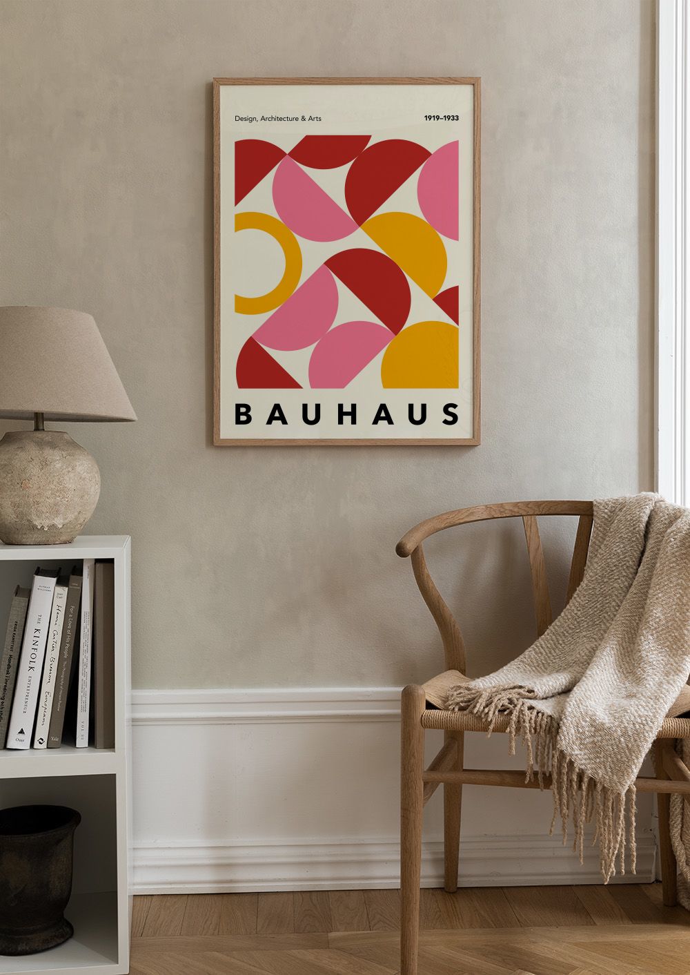 From $21.60A print featuring bold geometric shapes in red, pink, and orange on a cream background. Perfect wall art for lovers of modern design.