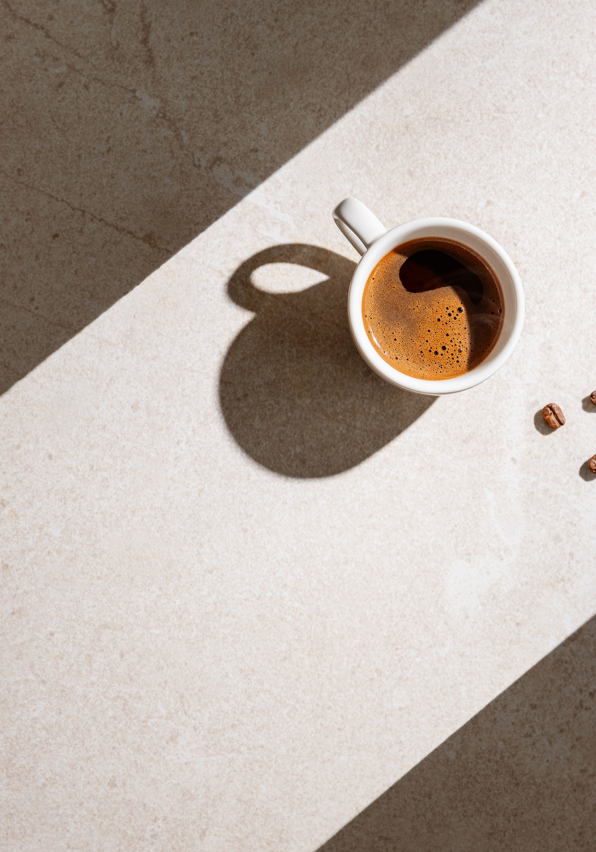 A print of a white coffee cup filled with dark coffee on a light beige surface. Coffee beans are scattered around the cup, creating a simple and minimalist look.
