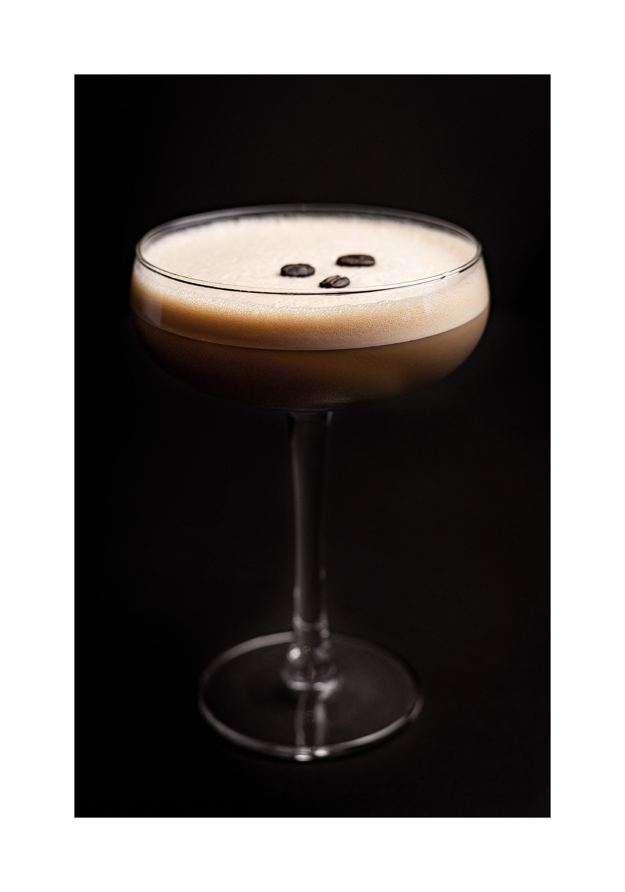 A print of an espresso martini with a creamy frothy top and three coffee beans. Perfect wall art for coffee and cocktail lovers!