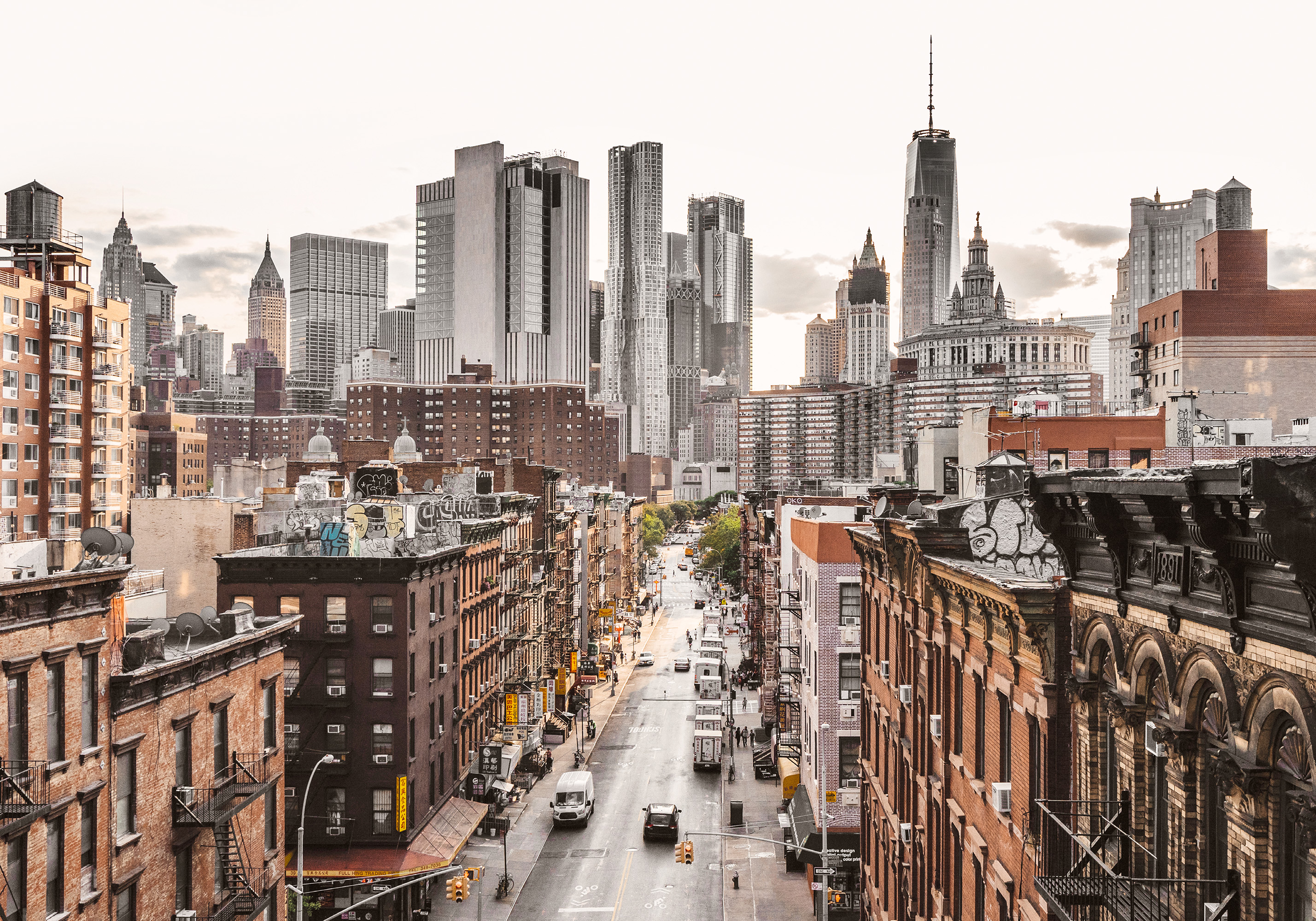 A print of a city street in Lower Manhattan with tall skyscrapers in the background. Perfect wall art for your home.