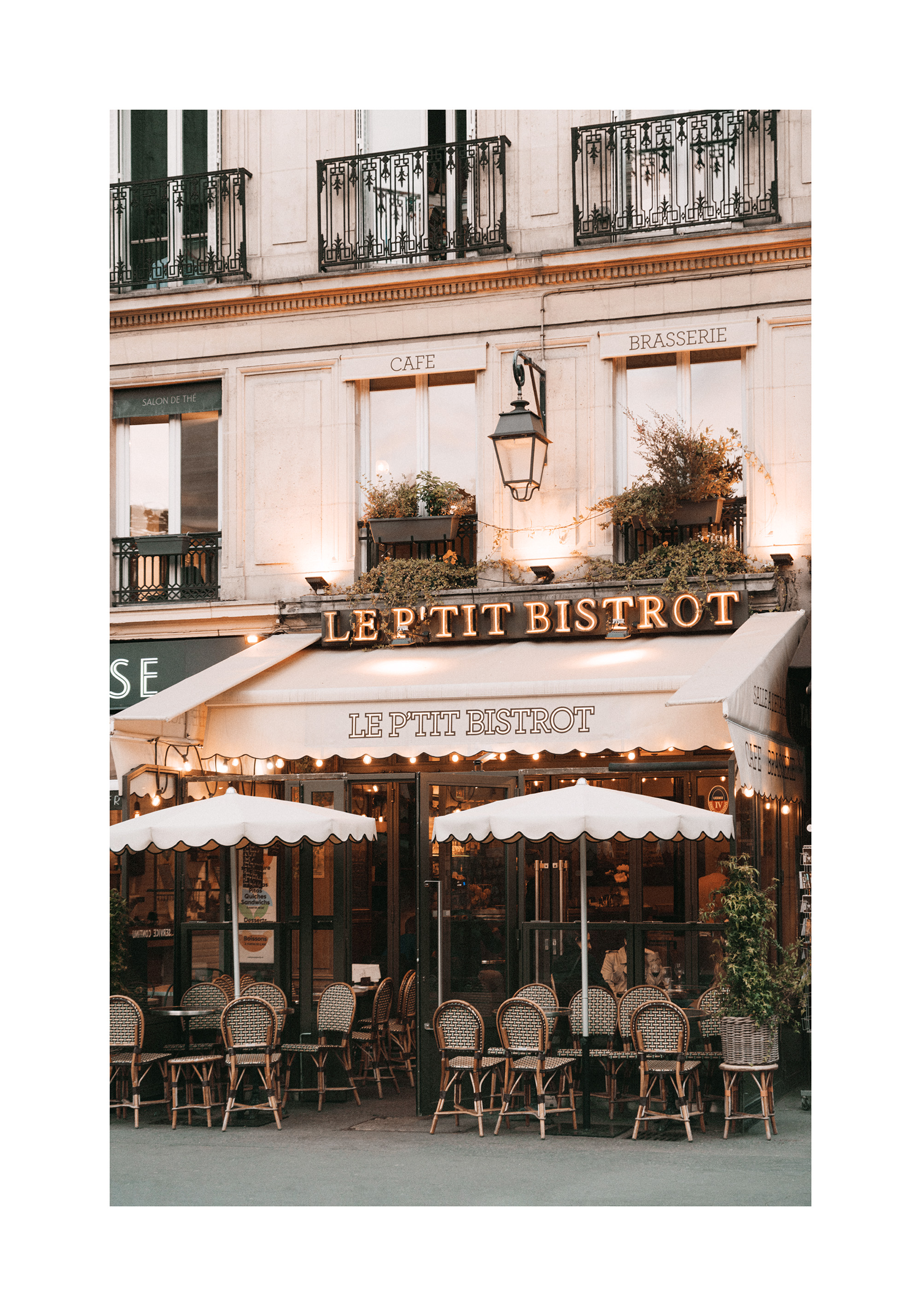 A print of a charming Parisian café with a cream awning, round tables, and woven chairs. Perfect wall art to bring a cosy French bistro vibe to your home.