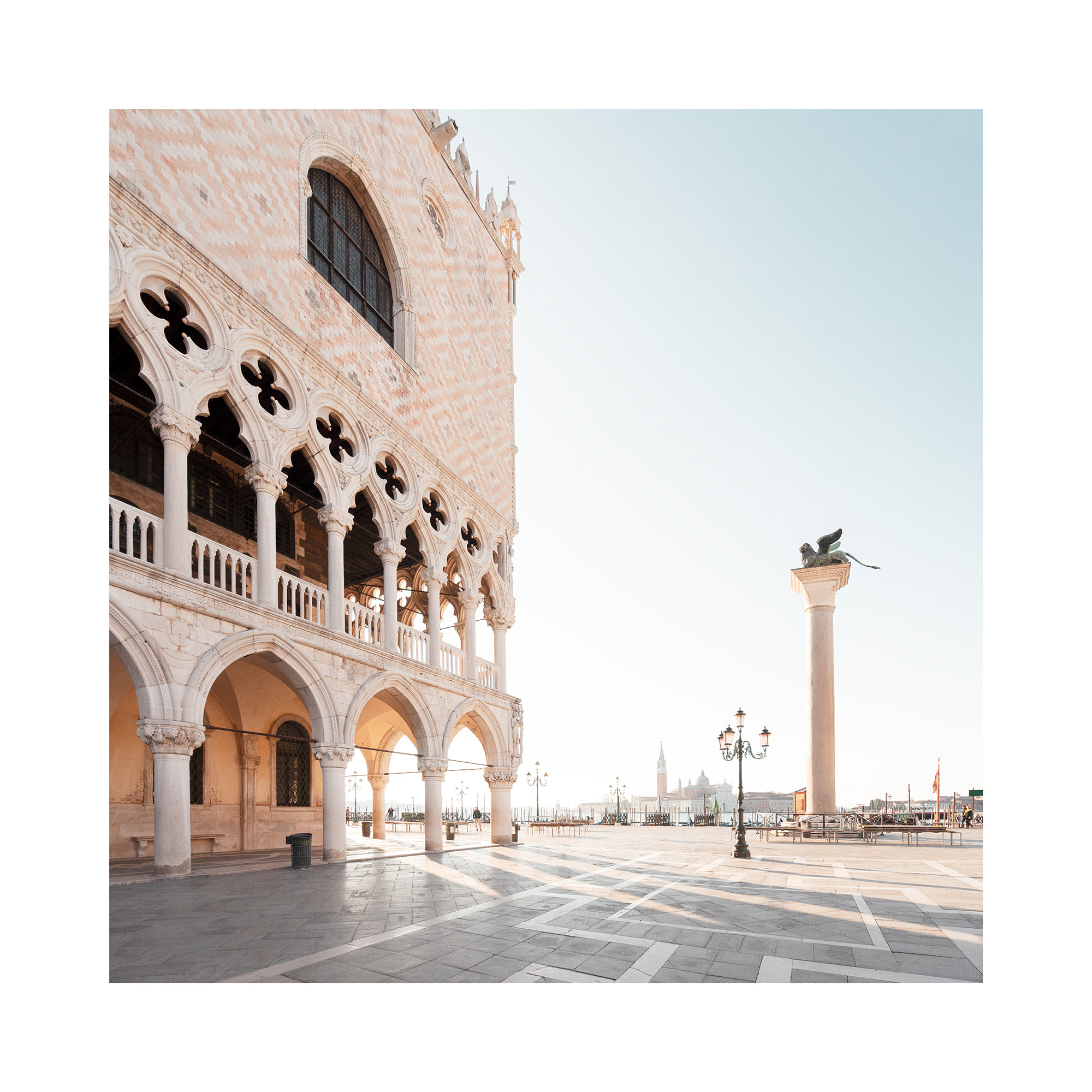 A print of the famous Piazza San Marco in Venice, featuring ornate buildings with arched windows, columns, and a tall statue. Perfect wall art for your home.